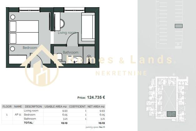Stan AP11 na prvom katu površine 19,19 m2 sastoji se od ulaznog prostora,dnevnog boravka,spavaće sobe,kuhinje,kupaonice i vanjskog parkinga.