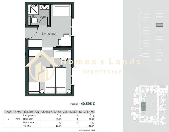 Stan AP6 na visokom prizemlju površine 21,63 m2 sastoji se od ulaznog prostora,dnevnog boravka,spavaće sobe,kuhinje,kupaonice i vanjskog parkinga.