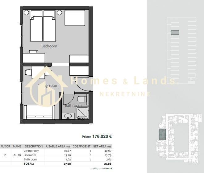 Stan AP19 na drugom katu površine 27,09 m2 sastoji se od ulaznog prostora,dnevnog boravka,spavaće sobe,kuhinje,kupaonice i vanjskog parkinga.