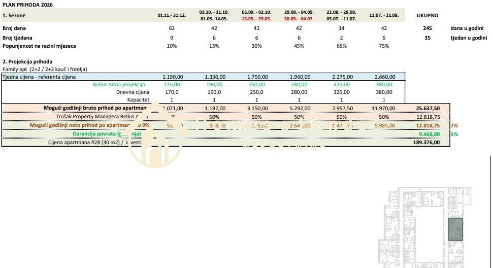 30 namještenih i etažiranih apartmana veličine 15–30 m²(mogućnost spajanja dvaju apartmana u veći stambeni prostor)