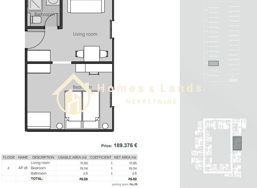 Stan AP28 na drugom katu površine 29,59 m2 sastoji se od ulaznog prostora,dnevnog boravka,kupaonice,spavaće sobe.