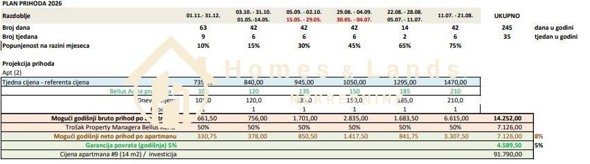 30 namještenih i etažiranih apartmana veličine 15–30 m²(mogućnost spajanja dvaju apartmana u veći stambeni prostor)