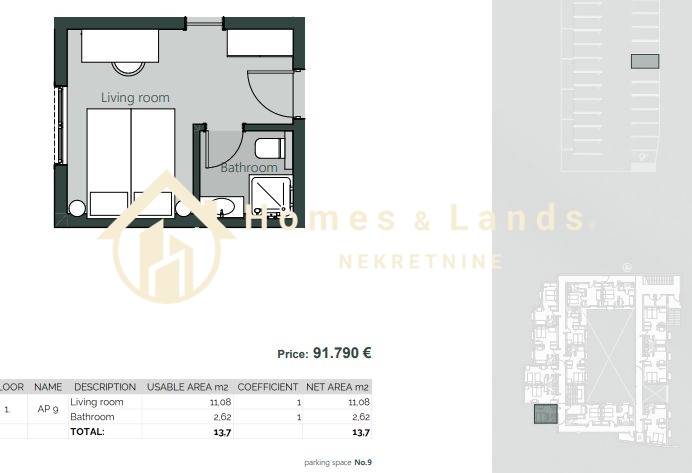 Stan AP9 na prvom katu površine 13,70 m2 sastoji se od ulaznog prostora,dnevnog boravka,kupaonice i vanjskog parkinga.