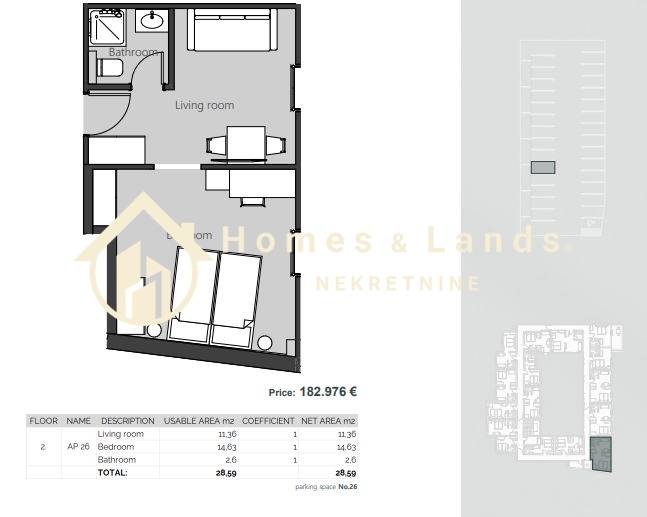 Stan AP26 na drugom katu površine 29 m2 sastoji se od ulaznog prostora,dnevnog boravka,kupaonice,spavaće sobe.