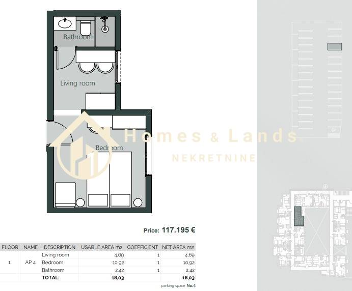 Stan AP4 u visokom prizemlju površine 18,03 m2 sastoji se od ulaznog prostora,dnevnog boravka,spavaće sobe,kupaonice i vanjskog parkinga.