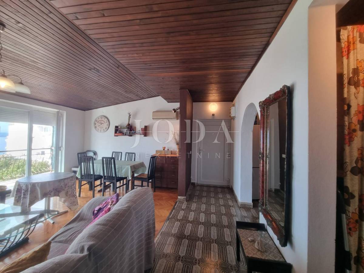 Prodajemo stan sa garažom u manjoj stambenoj zgradi ukupne površine 85m2. Stan se sastoji od dvije spavaće sobe, kuhinje, blagovaone, dnevnog boravka, kupaone, hodnika, terase i balkona sa kojeg se pruža pogled na more. Stanu pripada okućnica unutar koje se nalaze parkirna mjesta i roštilj. Nekretnina je namještena i klimatizirana i kao takva se i prodaje. Stan ima puno potencijala te uz manju adaptaciju posataje savršena nekretnina za život ili za turistički najam.