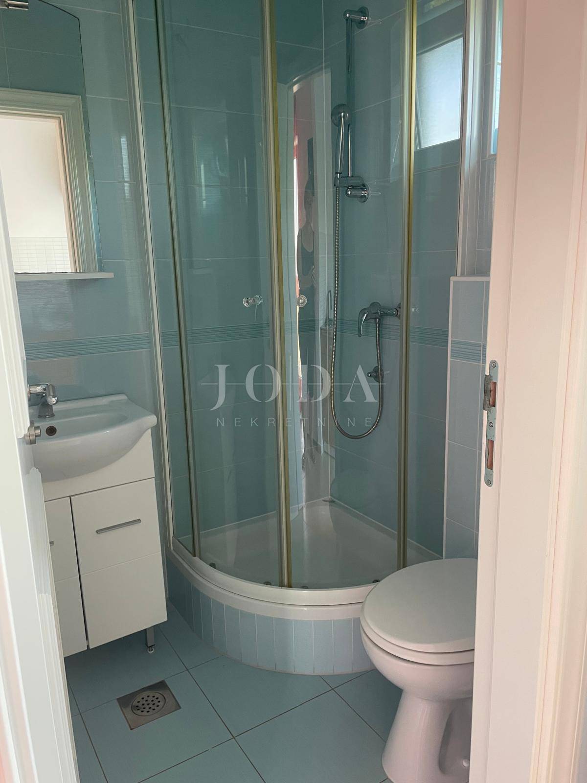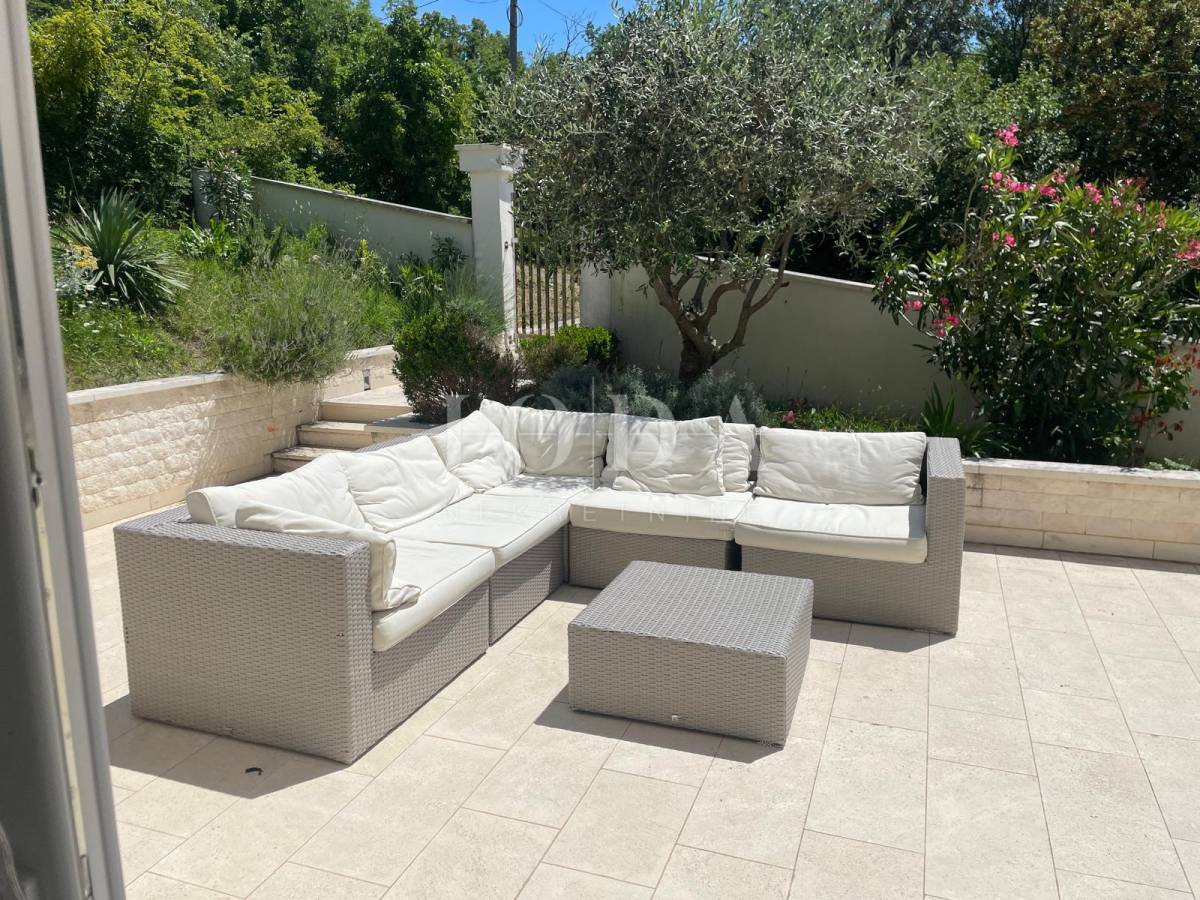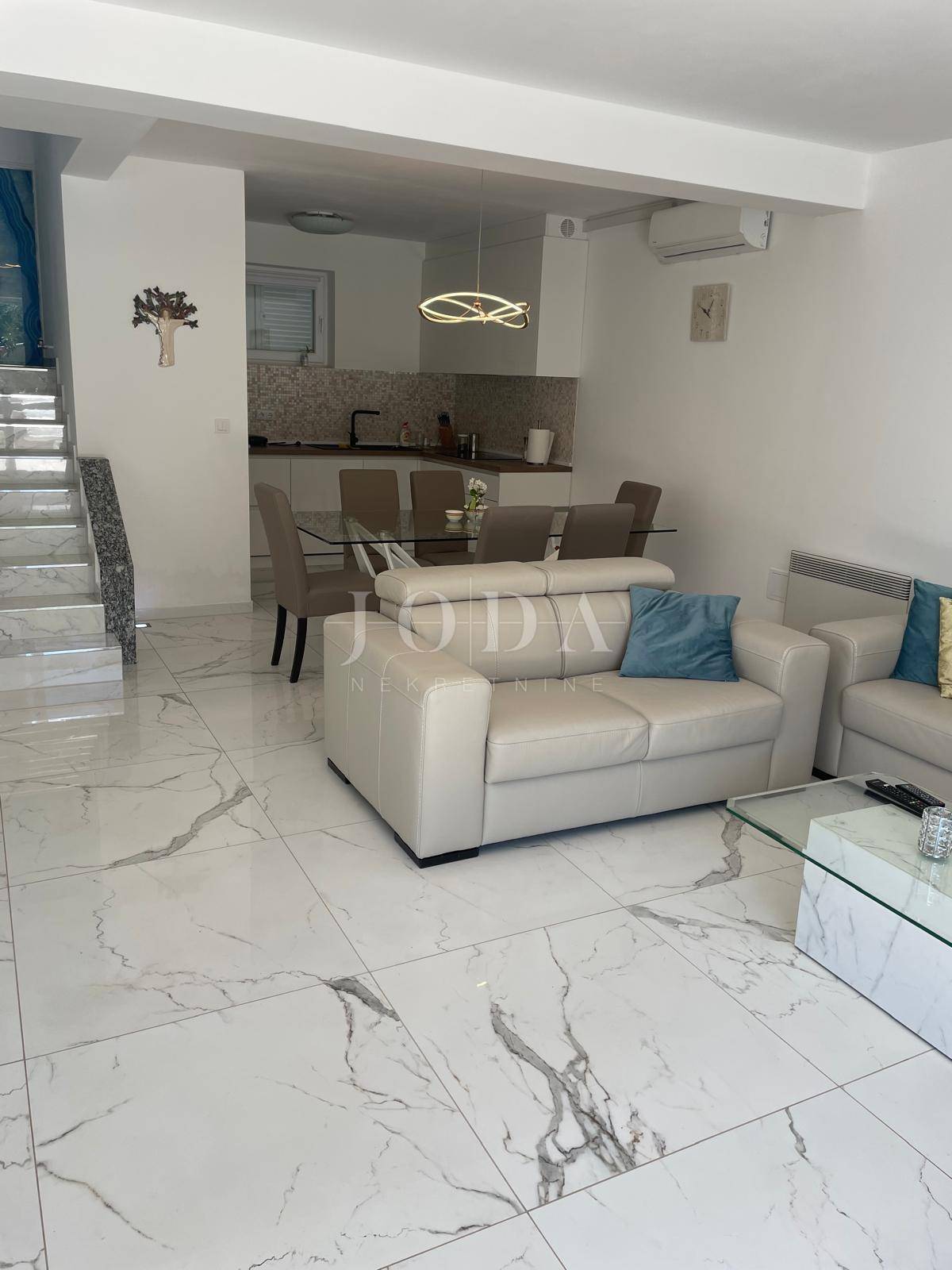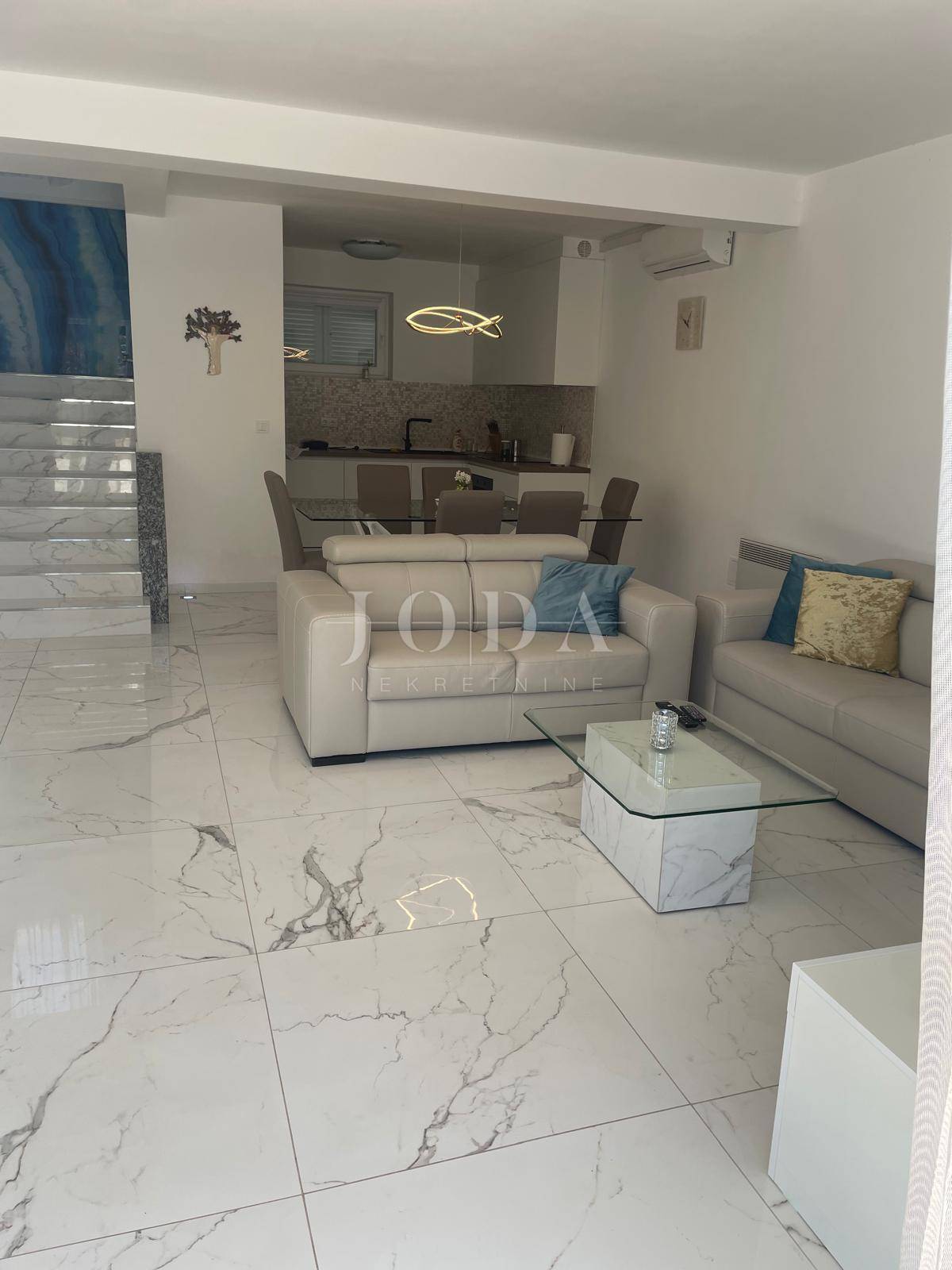 Ova moderno uređena kuća prostire se na tri etaže i ukupne je površine oko 200 m². Glavni, vlasnički stan zauzima prizemlje i prvi kat, ukupne površine 133 m². U prizemlju dominira prostrani dnevni boravak s kuhinjom i blagovaonicom otvorenog koncepta, koji se prirodno nastavlja na prostrane vrtne terase s obje strane kuće — idealne za uživanje u vanjskom prostoru i druženja na otvorenom. Dodatno su tu gostinjski toalet i spremište ispod stepeništa.