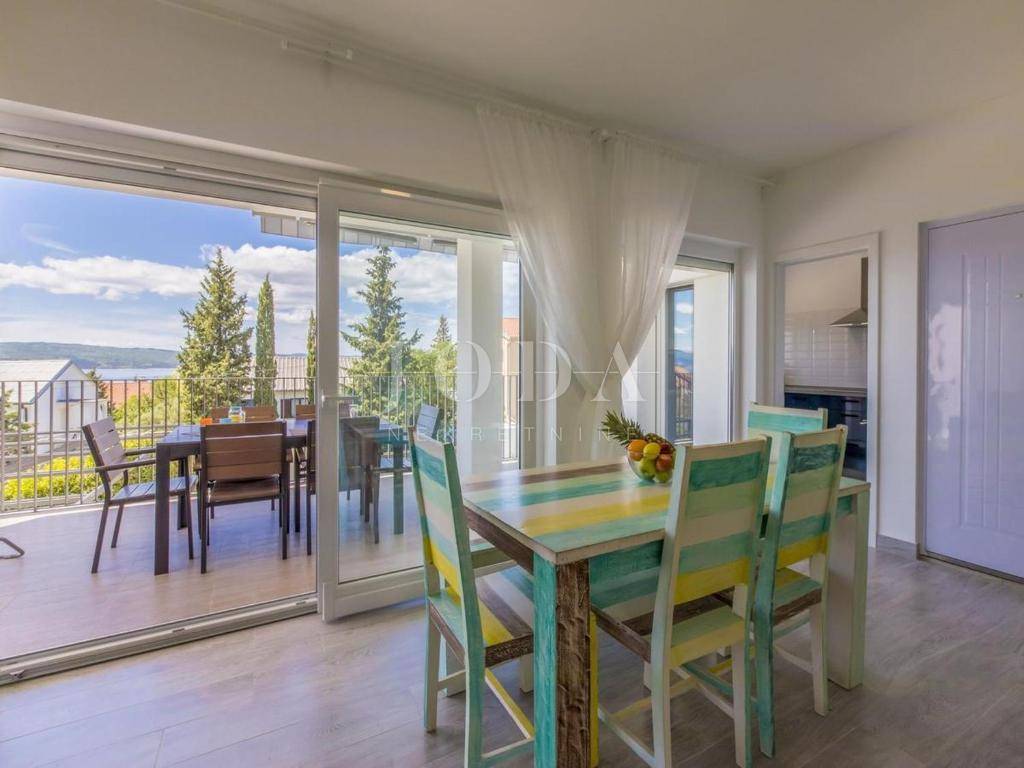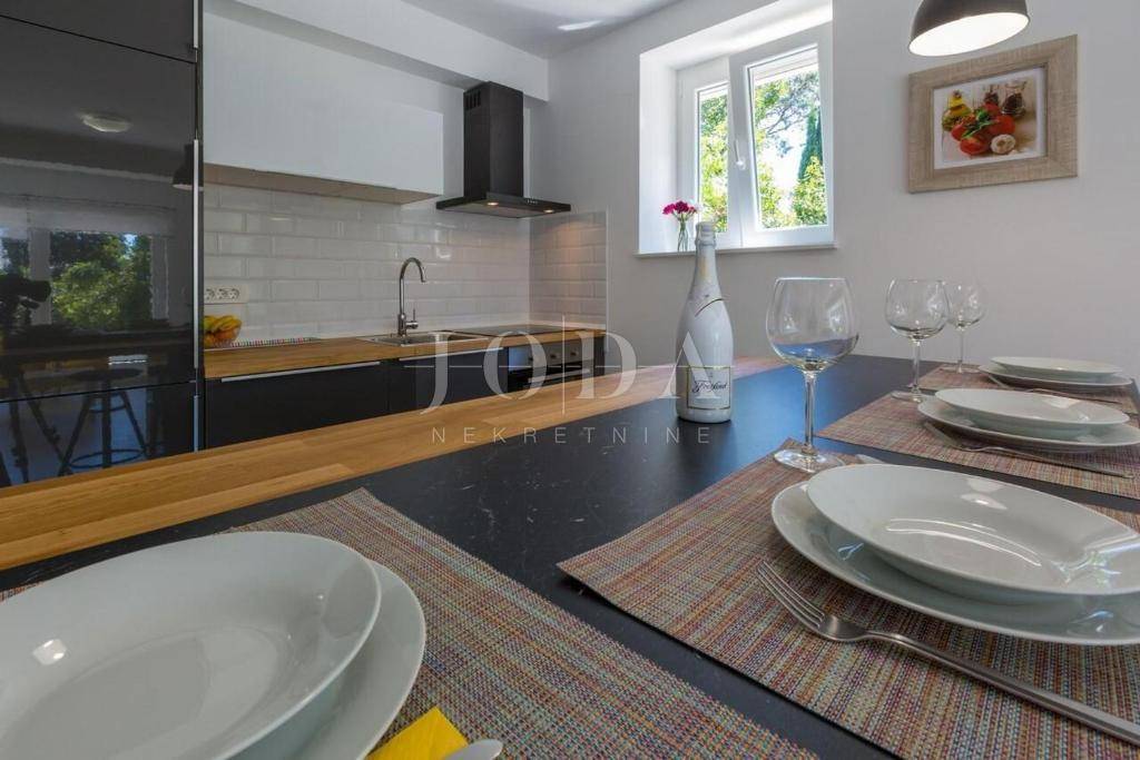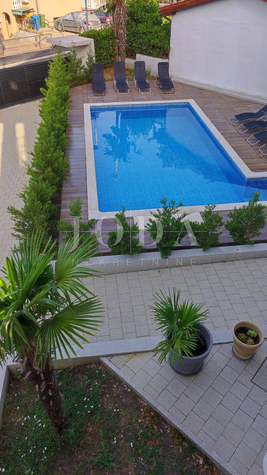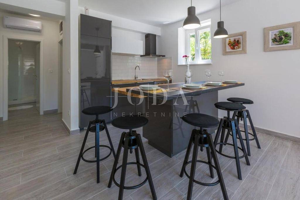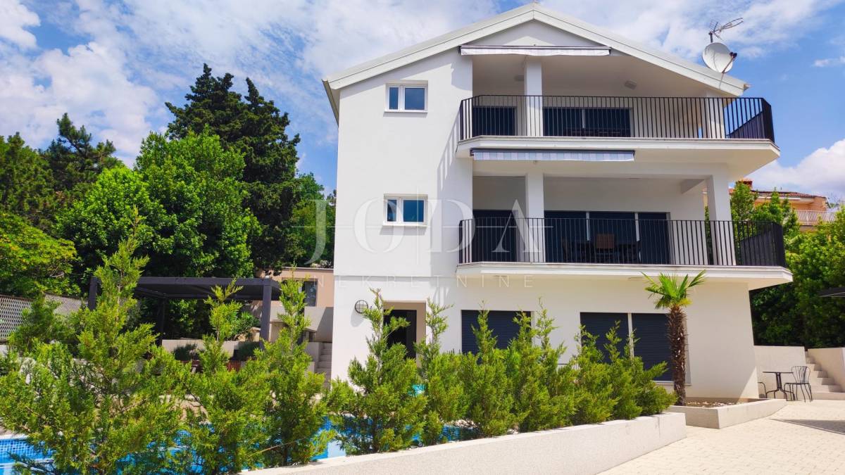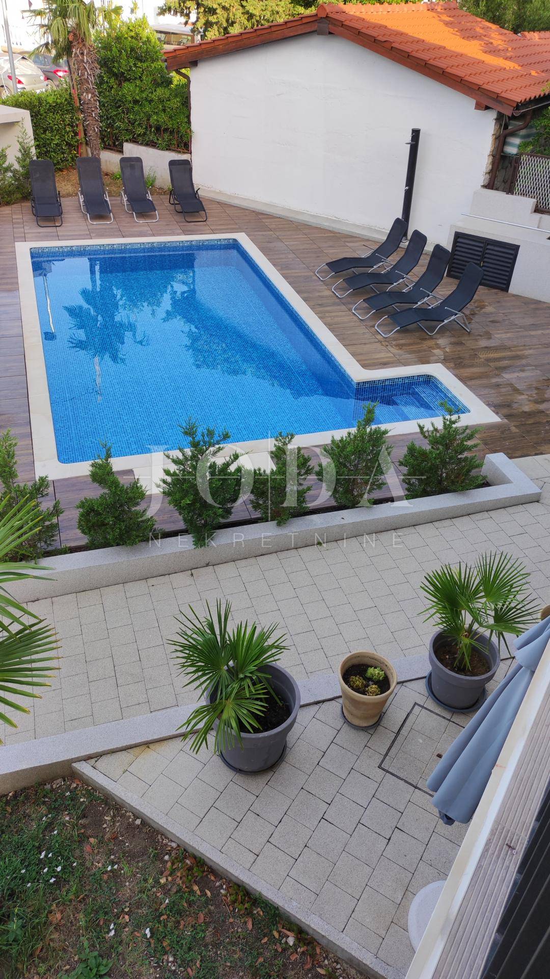 U Dramlju - Crikvenica, nalazi se lijepa, kompletno renovirana samostojeća kuća stambene površine 375m2 te velikom okućnicom. Kuća je tlocrtne površine 12.5x10 te se sastoji od četiri stana te izdvojenog objekta u dvorištu iza kuće. U prizemlju se nalaze dva stana. Manji stan je površine 37m2 + 3m2 terasa dok je površina većega stana u prizemlju 44m2 + 10m2 terasa. Na prvome katu nalazi se stan od 75m2 + 25m2 terase dok na drugome katu stanu iste površine kao i na prvome katu pripada još i malo spremište od 1,5m2. U dvorištu je odvojeni objekt sa terasom površine je 30m2. U dvorištu je i natkriveni parking gdje je moguće parkirati pet vozila te predivni bazen površine 32m2. Na objektu su obnovljene sve instalacije (voda, struja, kanalizacija), postavljena je nova vanjska PVC stolarija te unutarnja stolarija. Također u kući su novi podovi,kupaonice dok je sa vanjske strane nova fasada, krov i novo popločenje dvorišta. Ulazi u stanove opremljeni su protuprovalnim vratima, napravljena je i priprema za alarmni sustav te svaka soba u kući ima klima uređaj. Kuća se prodaje kompletno opremljena sa svim namještajem. Objekt, s obzirom na lokaciju i uređenost je svakako i dobra prilika za investiciju i turističku djelatnost, kategoriziran je sa 4* te može dobiti i 5* i na Booking.com stranici je ocijenjen sa ocjenom 9.6 (exceptional). Dobra mikrolokacija i predivan pogled, te sve prije navedeno su razlozi zbog kojih ova nekretnina zasljužuje Vašu pažnju.