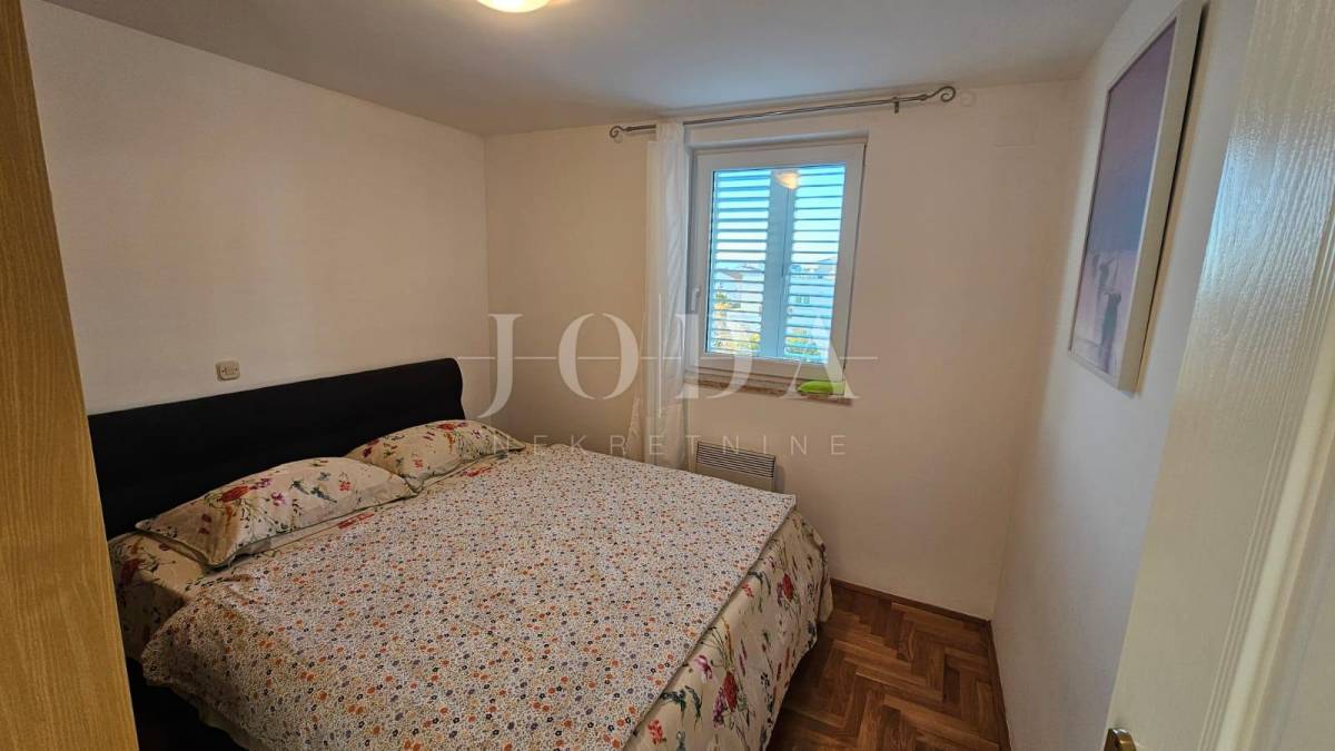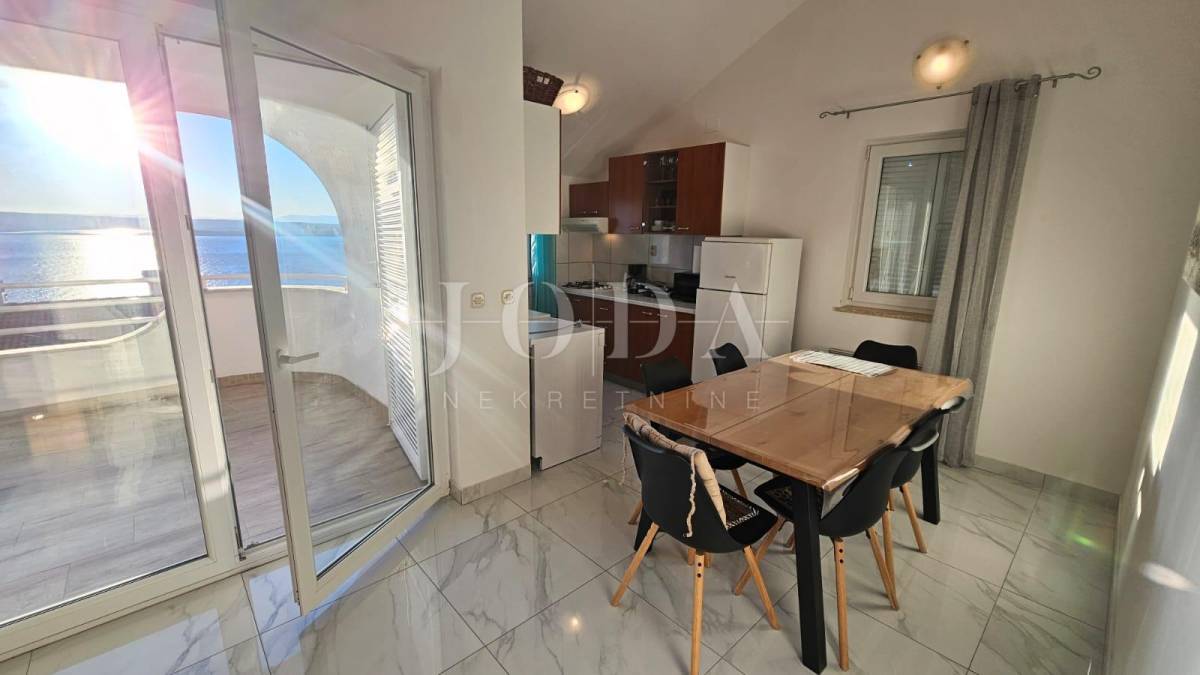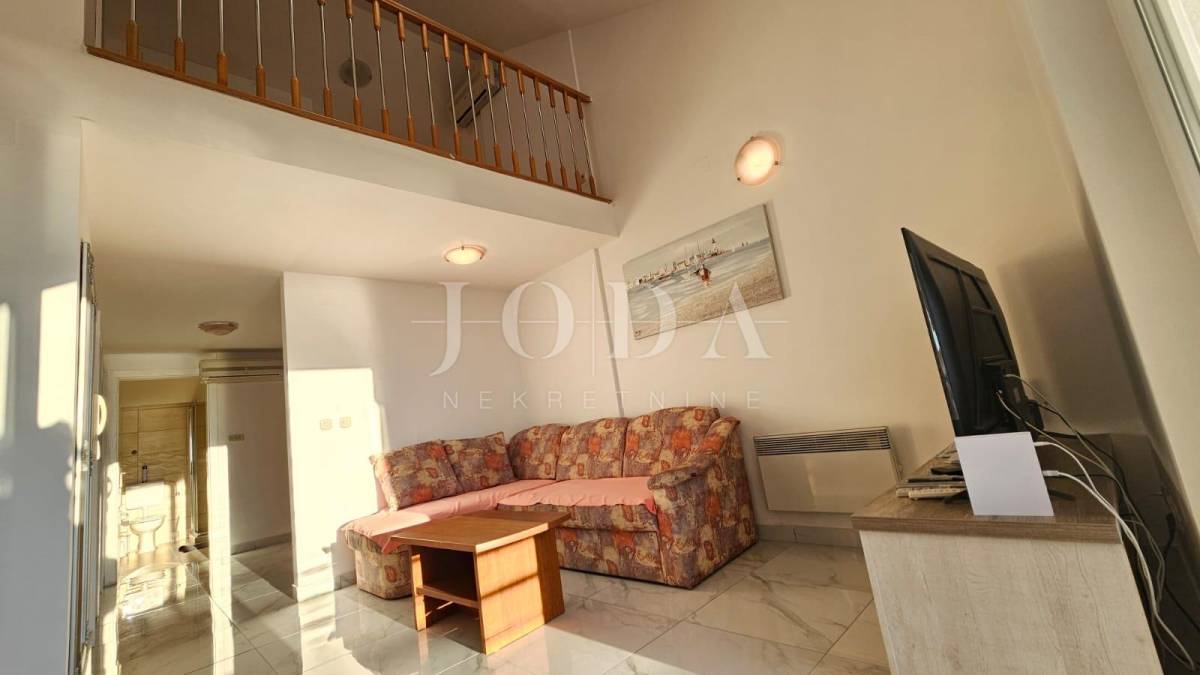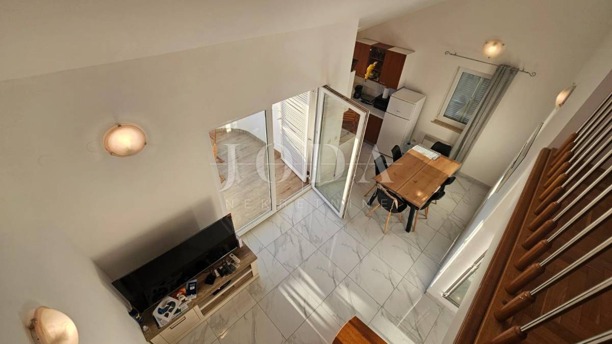 Prodaje se prostran stan od 83,50 m², smješten na 2. katu zgrade, u mirnom i atraktivnom dijelu, nedaleko od mora. Stan se sastoji od ulaznog predprostora sa spiralnim stubištem, dnevnog boravka, blagovaonice i kuhinje, dvije spavaće sobe, kupaonice te velike terase površine 61,53 m² s predivnim pogledom na more. Spiralno stubište vodi u visoko potkrovlje površine 21,97 m², koje uključuje galeriju, dodatnu sobu, WC te ostavu.