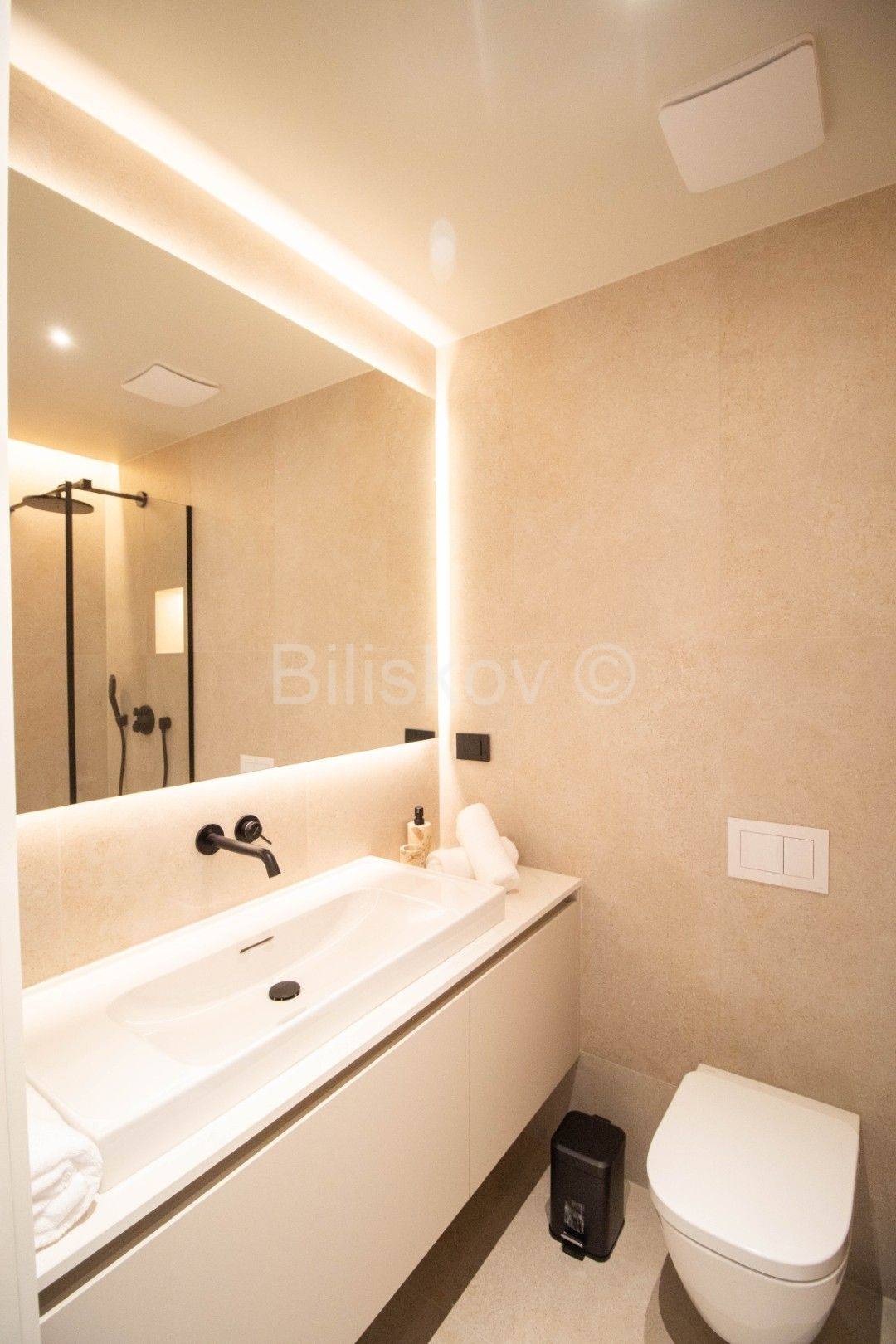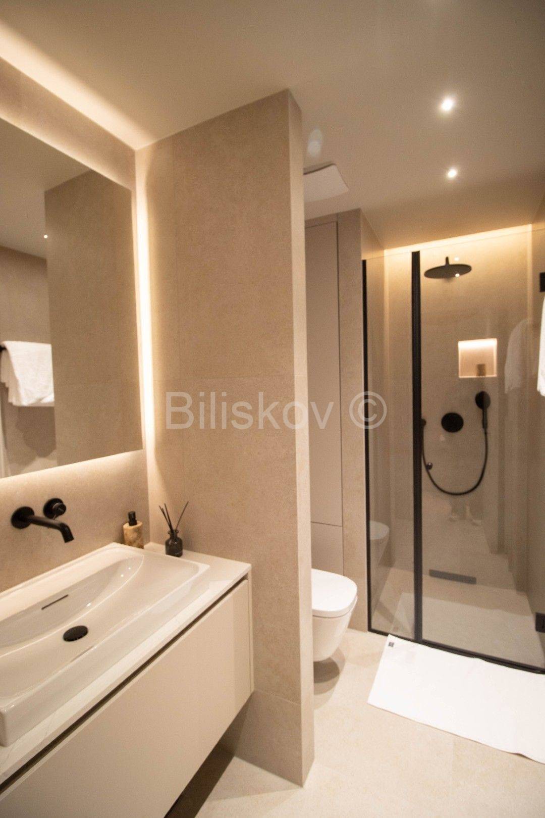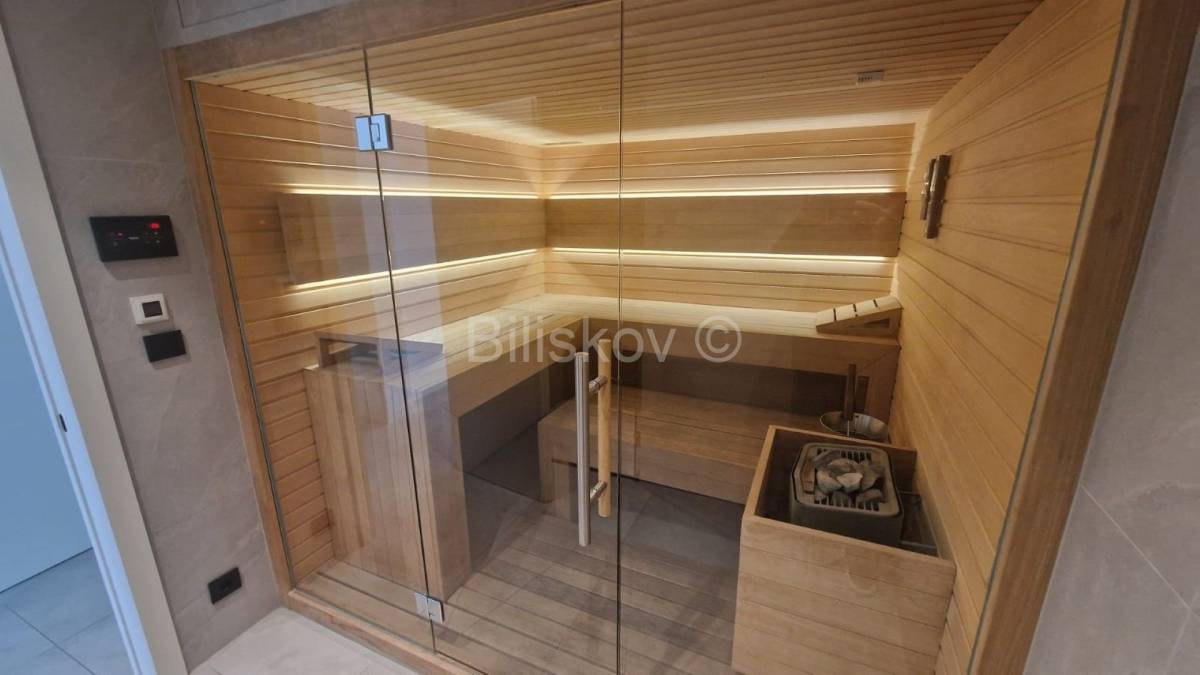Klimatiziran je Daikin dizalicom topline sve prostorije, postavljeno je podno grijanje, kompletno je opremljen i svi materijali i uređaji koji su u stanu su kvalitete najvišeg nivoa.
