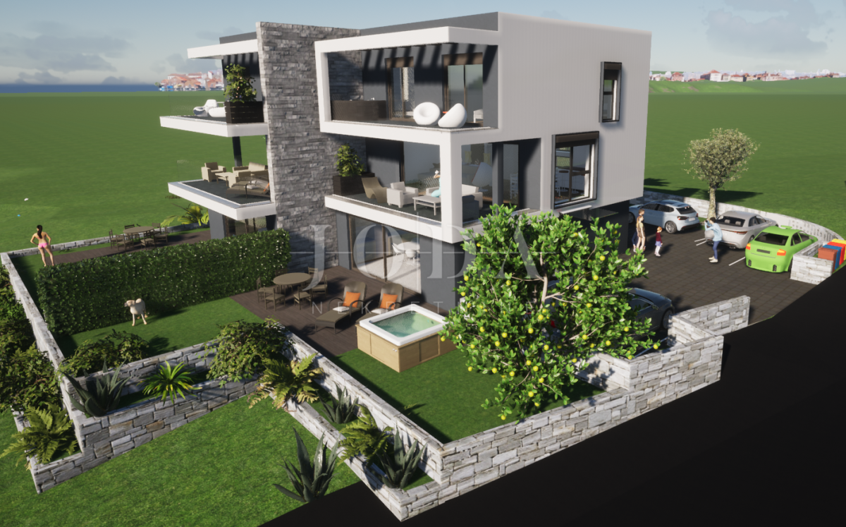 Prodaje se atraktivan dvoetažni apartman s pogledom na more i uređenom okućnicom u novoj urbanoj villi s četiri stambene jedinice, u Puntu na otoku Krku.