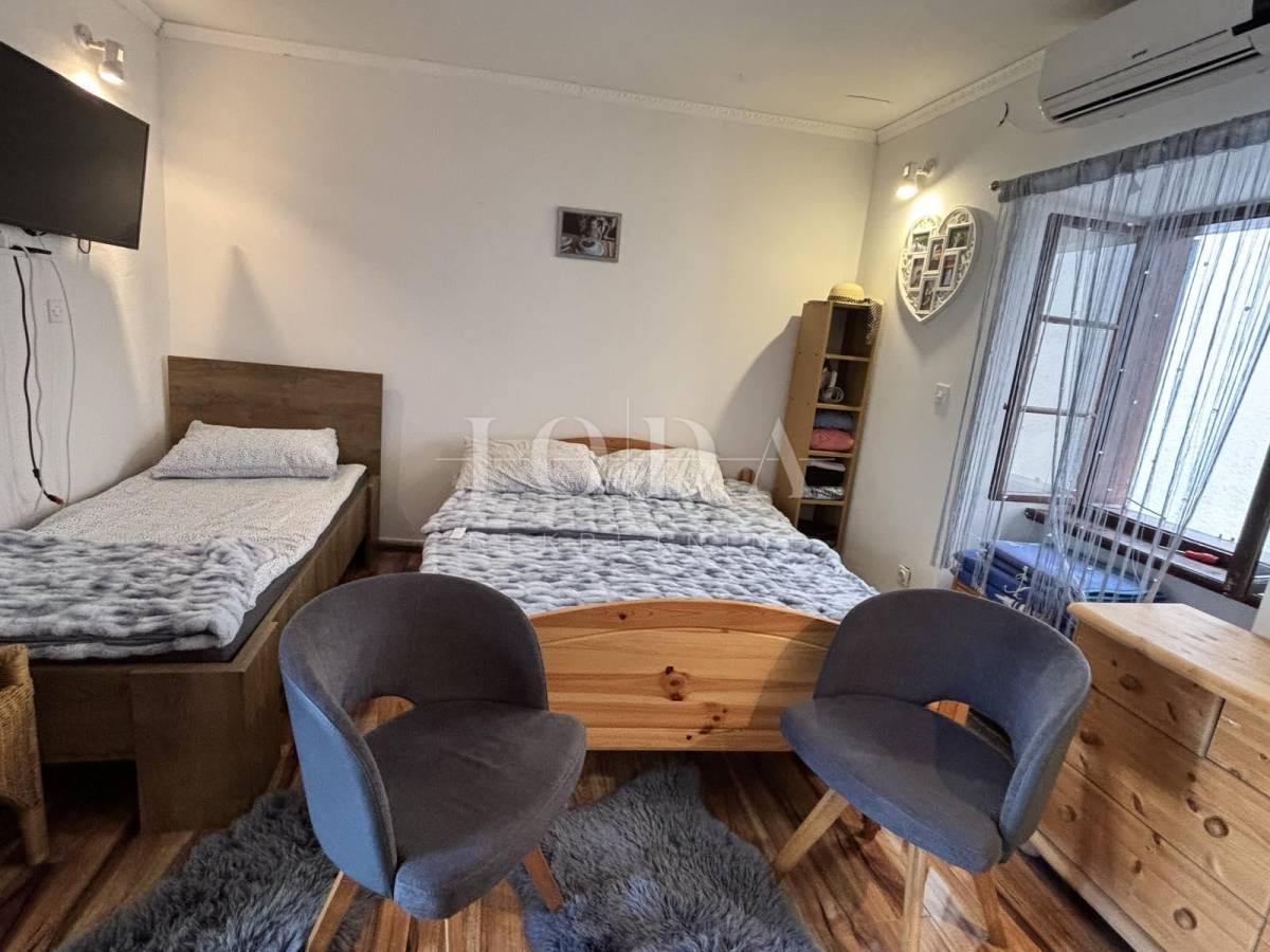 U prizemlju se nalazi kuhinja s dnevnim boravkom te kupaonica s tušem, dok se WC nalazi izvan stambenog dijela prizemlja, odmah pokraj ulaza u stan. Vanjskim stubištem se dolazi na kat na kojem se nalazi jedna prostrana spavaća soba. Grijanje je osigurano putem električne grijalice i klima uređaja, što omogućuje ugodan boravak tijekom cijele godine.