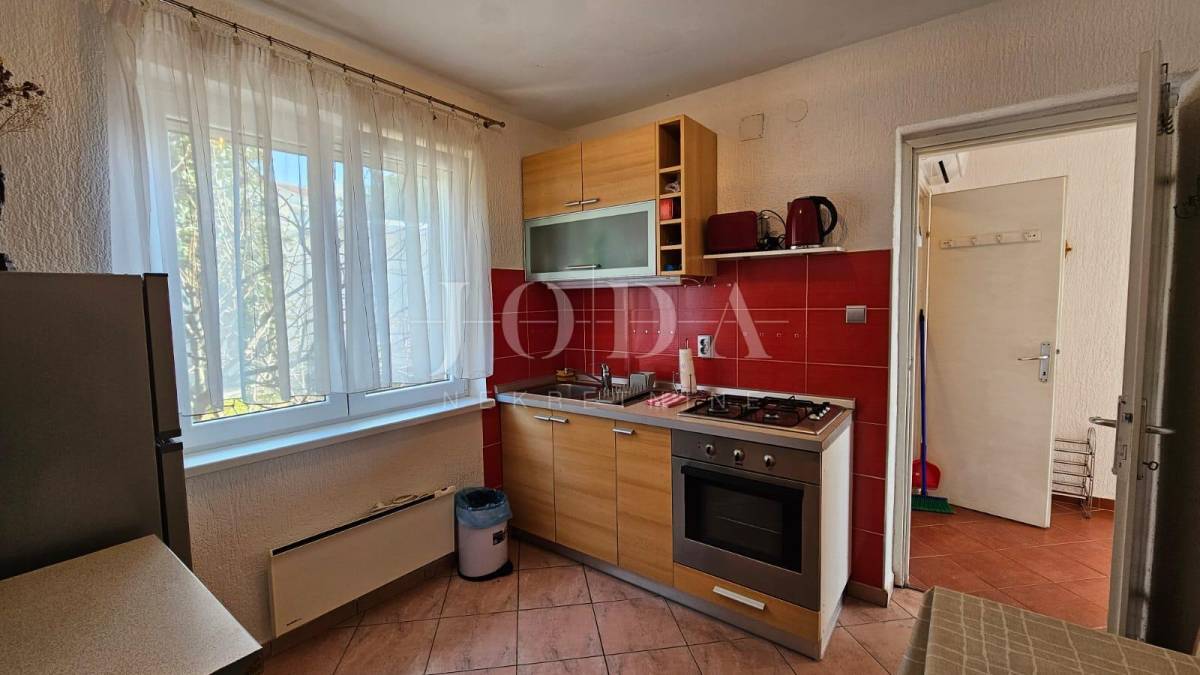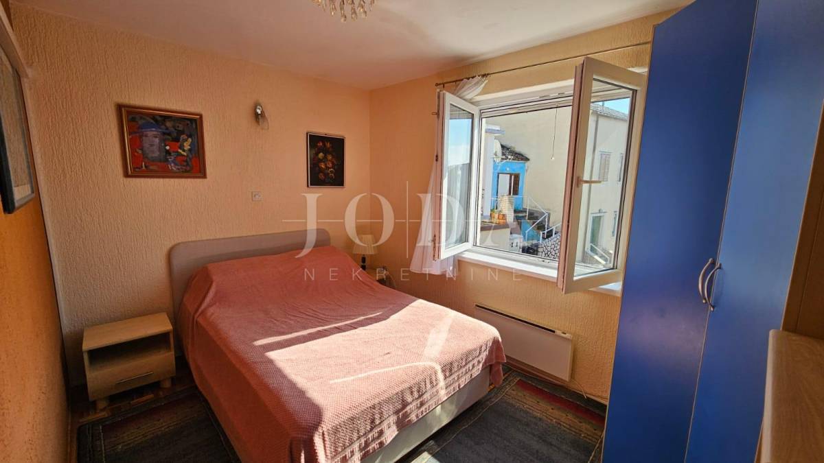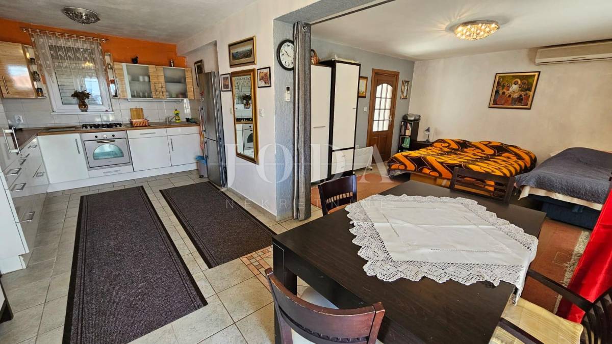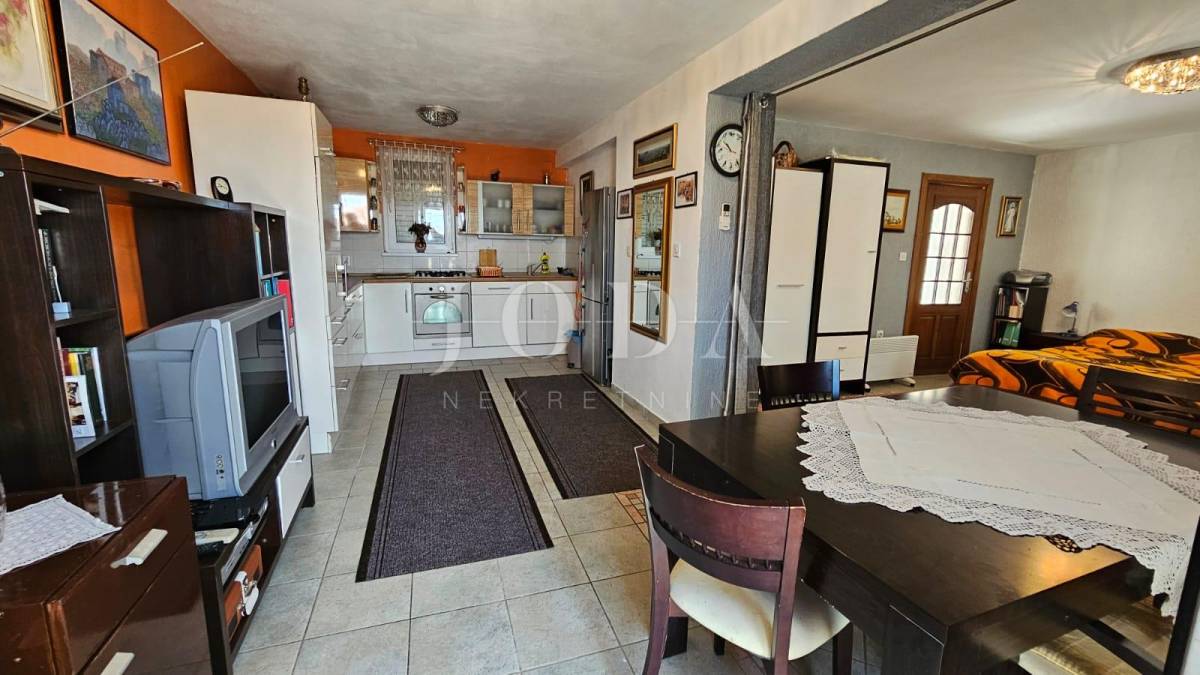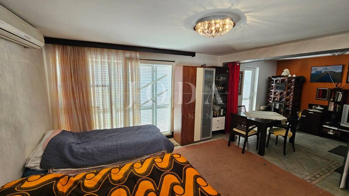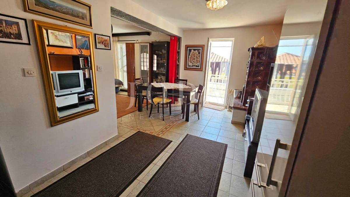 Prodajemo dvojnu kuću sa dvije odvojene jedinice. U prizemlju se nalazi manji klimatizirani apartman koji se sastoji od ulaznog hodnika, kupatila i velikog prostora gdje se smjestila spavaća soba i kuhina s blagovaonom (sa malim preinakama se može odvojiti u dvije zasebne prostorije). Iz blagovaonice (gdje se smjestila i velika kalijeva peć) se izlazi na lijepu terasu s pogledom na more.