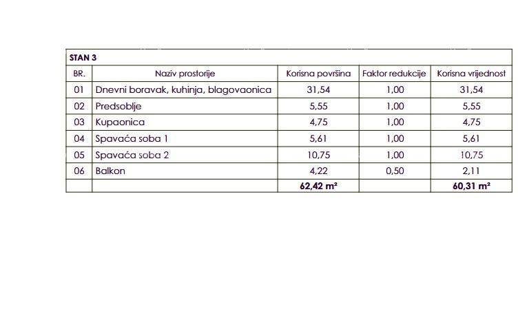 Sta ima površinu od 62.42 m2 i sastoji od 2 spavaće sobe, dnevnog boravka s kuhinjom te balkona od 4.22 m2. Postoji mogućnost da se napravi još jedna spavaća soba.