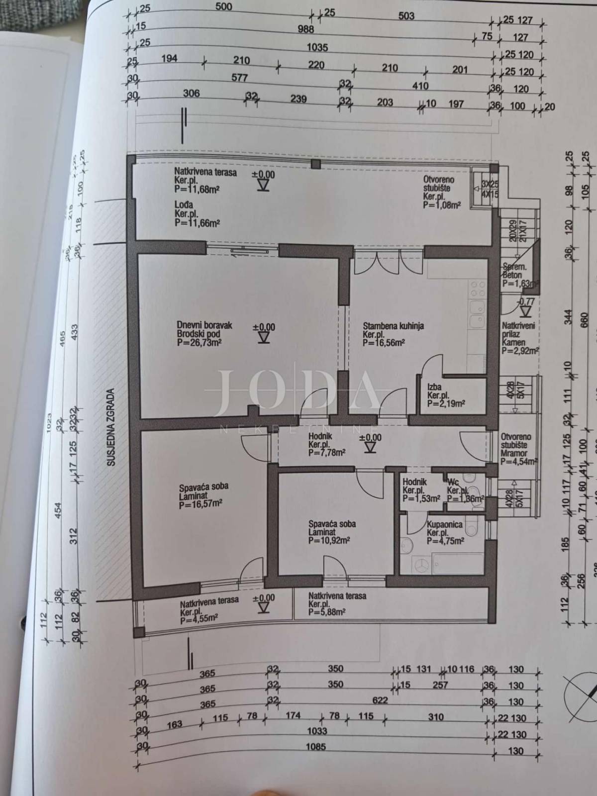 U prizemlju se nalazi kupaonica, odvojen WC, dvije prostrane spavaće sobe s izlazom na balkon, kuhinja s blagovaonicom i veliki dnevni boravak s izlazom na veliku natkrivenu terasu od 35m2.