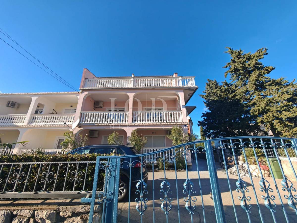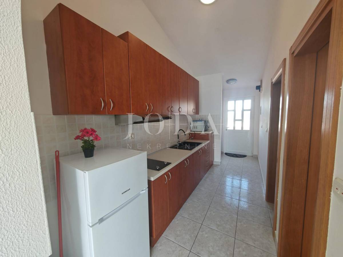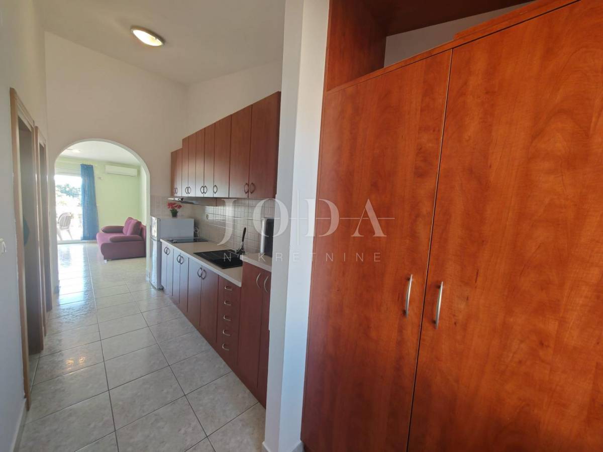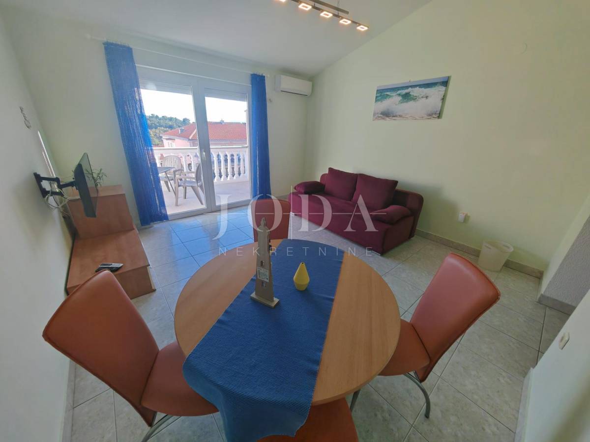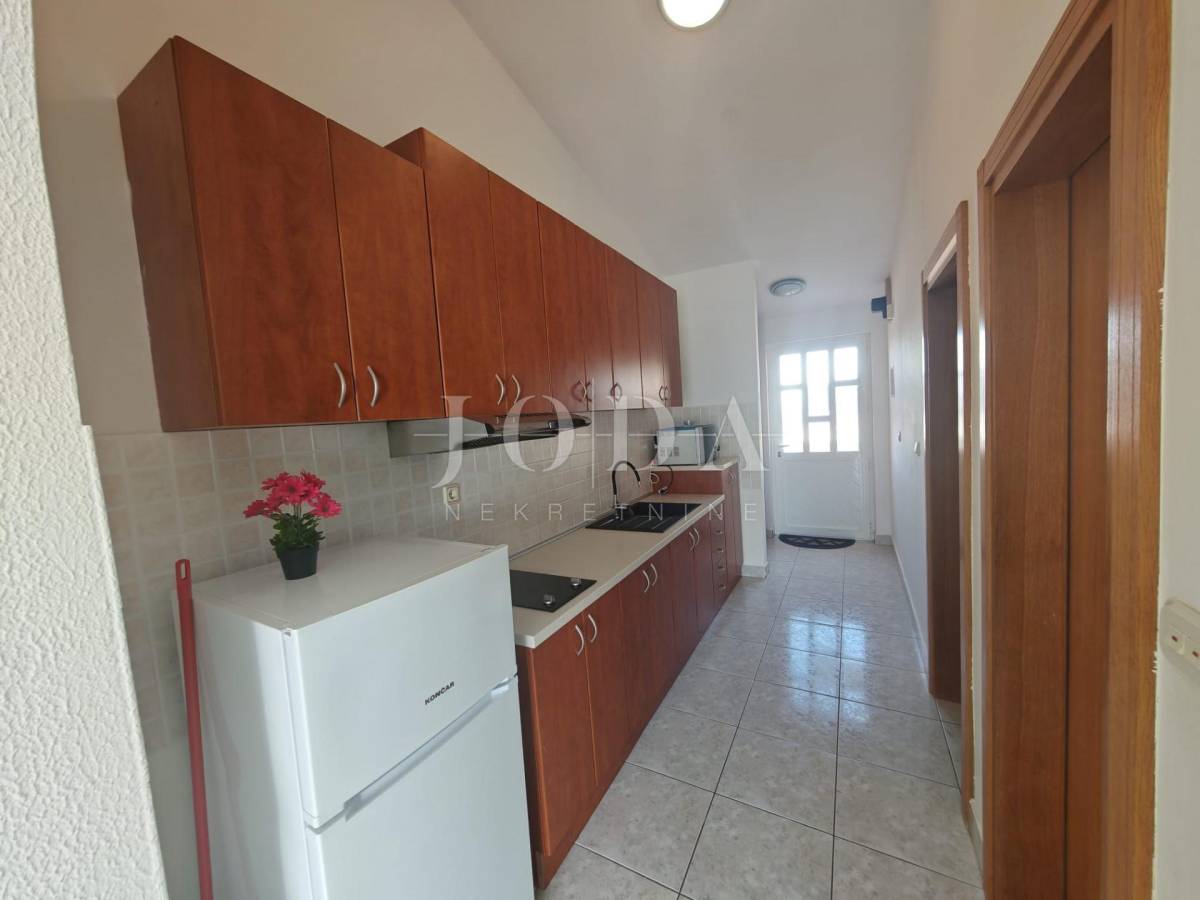 Prodajemo etažu na kraju mirne slijepe ulice koja se sastoji od dva odvojena stana. Stanovi se sastoje od ulaznog hodnika, spavaće sobe, kupaonice i dnevnog boravka s blagovaonicom. Oba stana imaju i južnu i sjevernu terasu s pogledom na more. Stanovi su izuzetno uredni, klimatizirani i odmah useljivi. Etaži pripadaju i dva parkirna mjesta na okućnici.