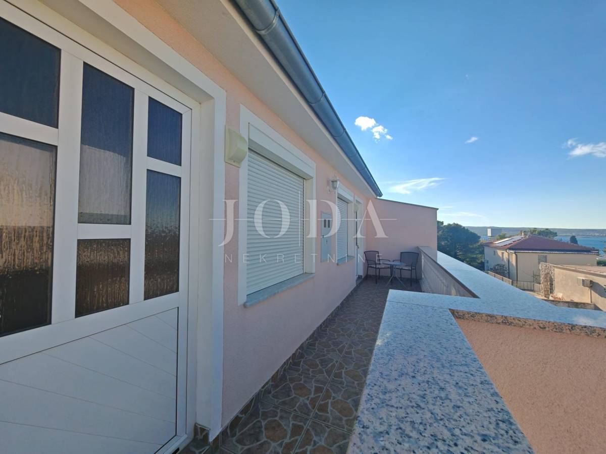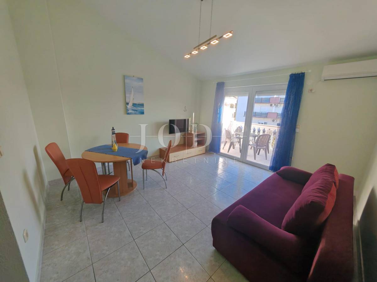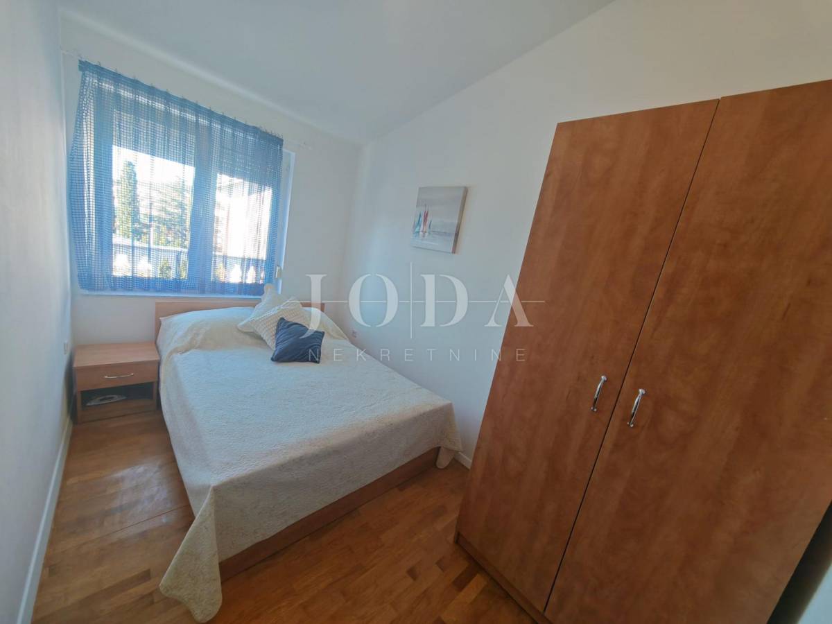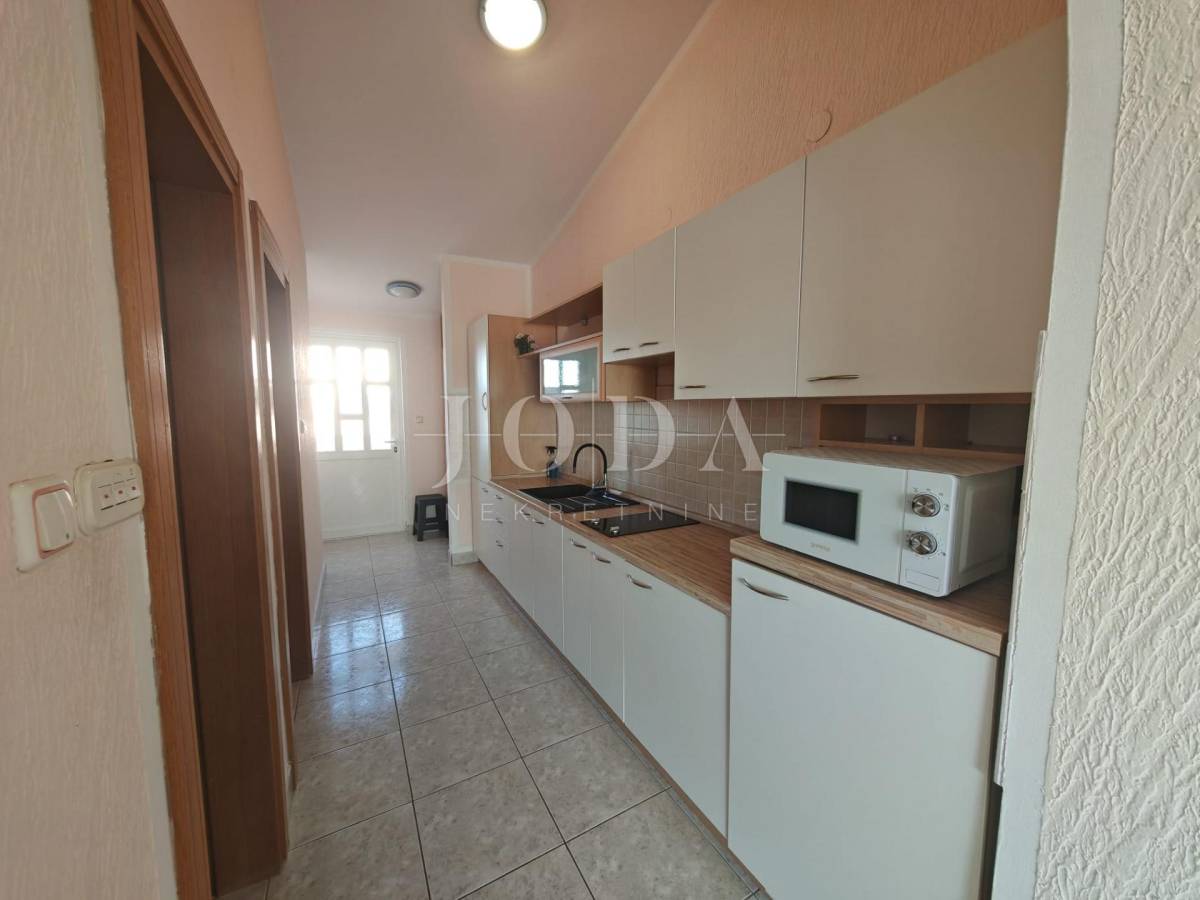 Prodajemo etažu na kraju mirne slijepe ulice koja se sastoji od dva odvojena stana. Stanovi se sastoje od ulaznog hodnika, spavaće sobe, kupaonice i dnevnog boravka s blagovaonicom. Oba stana imaju i južnu i sjevernu terasu s pogledom na more. Stanovi su izuzetno uredni, klimatizirani i odmah useljivi. Etaži pripadaju i dva parkirna mjesta na okućnici.