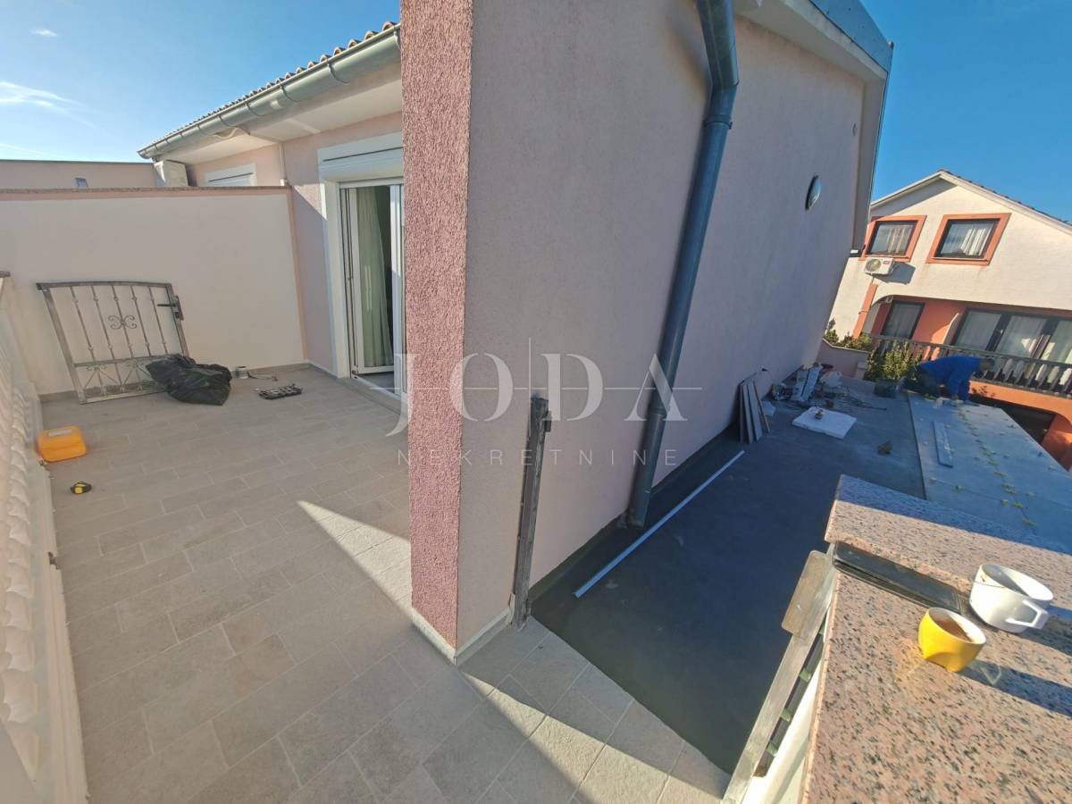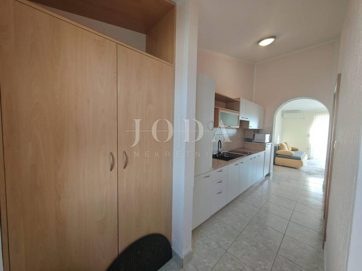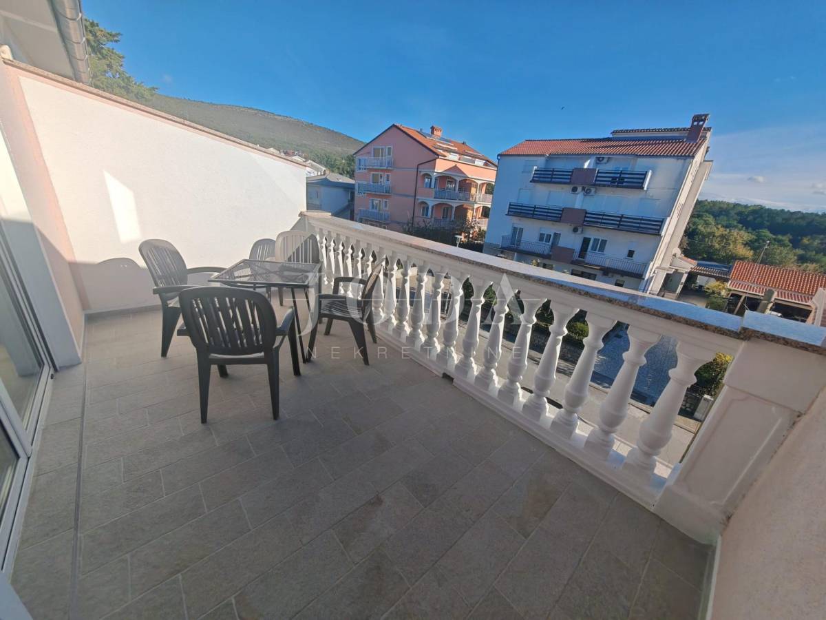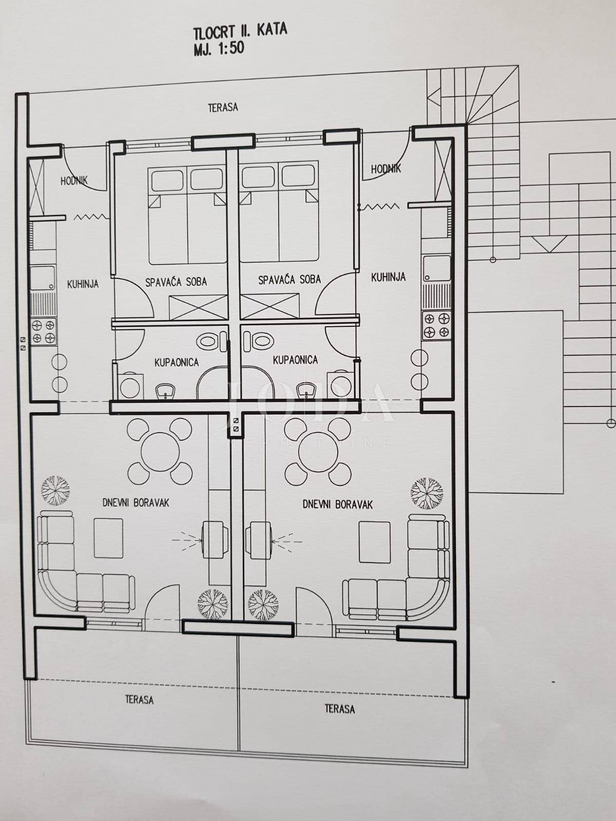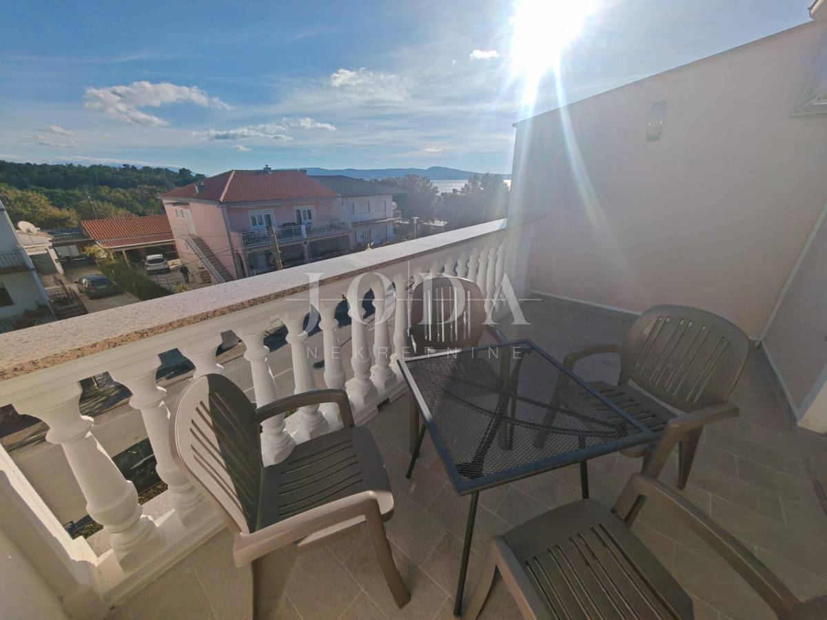 Prodajemo etažu na kraju mirne slijepe ulice koja se sastoji od dva odvojena stana. Stanovi se sastoje od ulaznog hodnika, spavaće sobe, kupaonice i dnevnog boravka s blagovaonicom. Oba stana imaju i južnu i sjevernu terasu s pogledom na more. Stanovi su izuzetno uredni, klimatizirani i odmah useljivi. Etaži pripadaju i dva parkirna mjesta na okućnici.