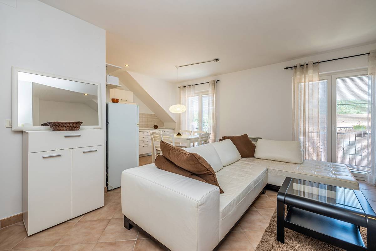 Unutarnji raspored uključuje prostrani dnevni boravak povezan s kuhinjom i blagovaonicom, udobnu spavaću sobu, moderno opremljenu kupaonicu i balkon koji pruža pogled na okolno zelenilo. Stan je potpuno opremljen novim, kvalitetnim namještajem koji je uključen u cijenu, što budućem vlasniku omogućuje trenutno useljenje – bez dodatnih ulaganja.