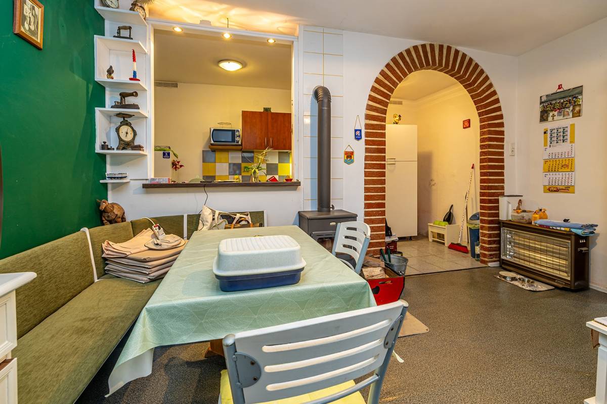 Kuća se prostire na tri etaže. U prizemlju se nalazi autentična konoba, savršeno mjesto za druženja i opuštanje u toplom ambijentu, te dodatna prostorija koja se može jednostavno preurediti u kupaonicu. Uz kuću je smještena garaža, iznad koje je uređena terasa s roštiljem, pogodna za boravak na otvorenom tijekom toplijih mjeseci.