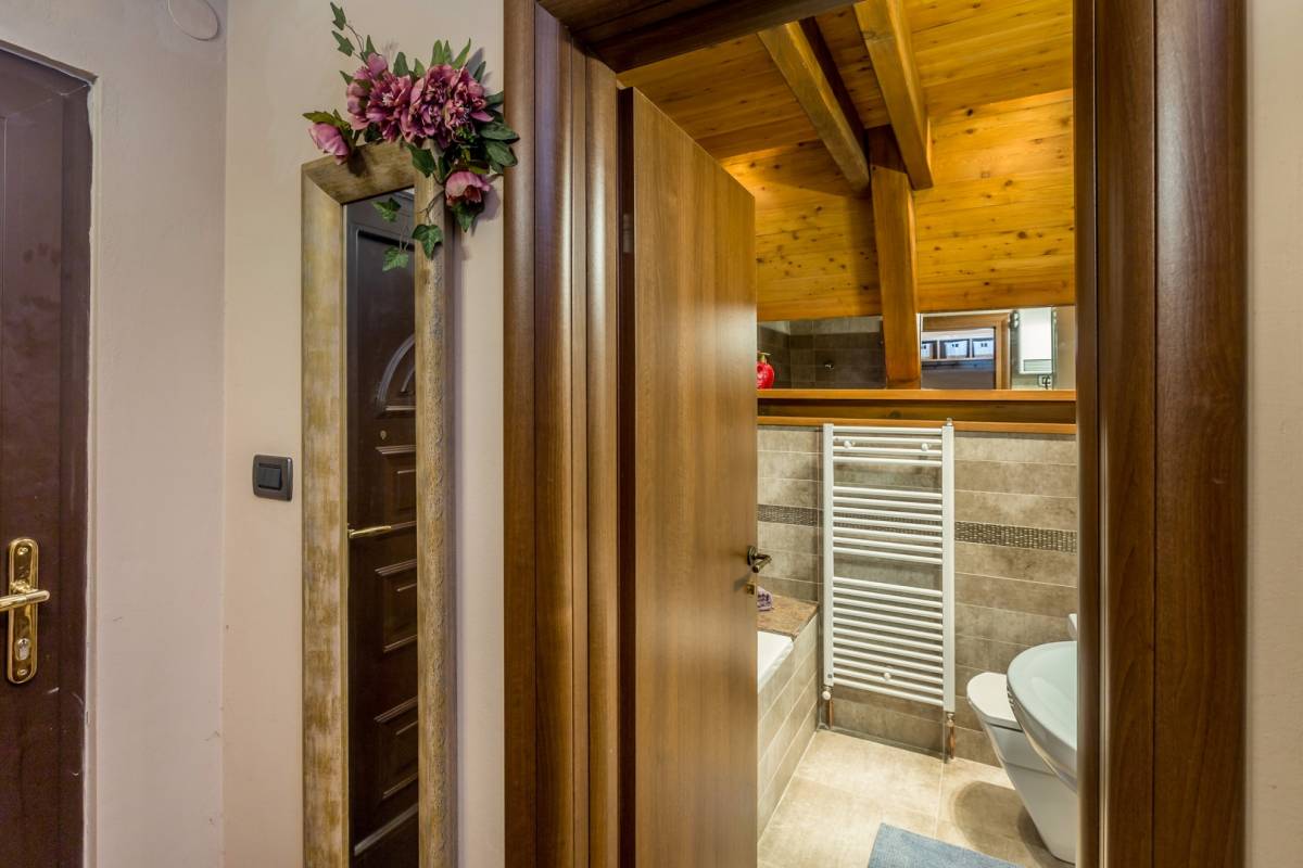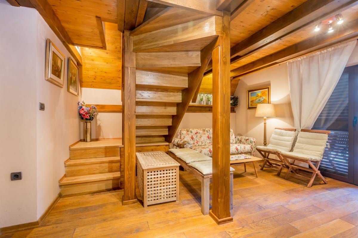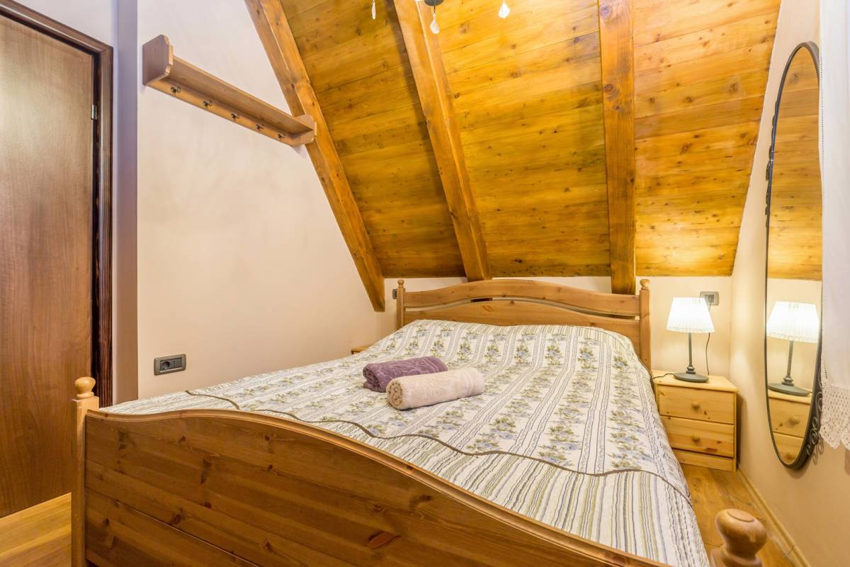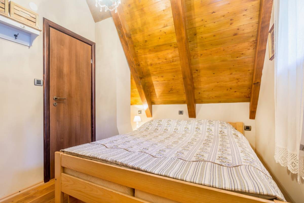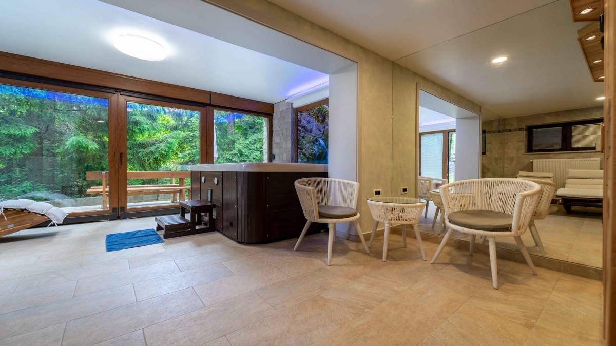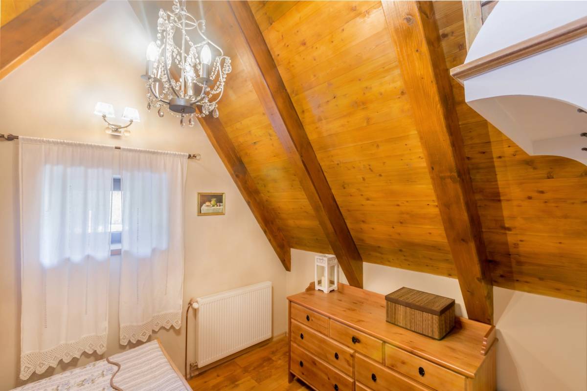 Prizemlje kuće rezervirano je za wellness zonu koja uključuje infracrvenu saunu, hidromasažni bazen, ležaljke za odmor i kupaonicu s tušem, bideom i WC-om. Iz wellnessa se izlazi na prostranu terasu. Na prvom katu nalazi se udoban dnevni boravak s blagovaonicom, opremljen klima uređajem i povezan s natkrivenom terasom, savršenom za uživanje u prirodi. Kuhinja je funkcionalna i potpuno opremljena, a na istoj etaži nalazi se i kupaonica s kadom i WC-om. Visoko potkrovlje sadrži dvije spavaće sobe s kosim stropovima, stvarajući ugodan ambijent za odmor.