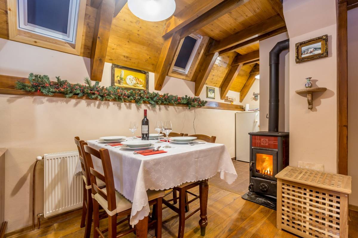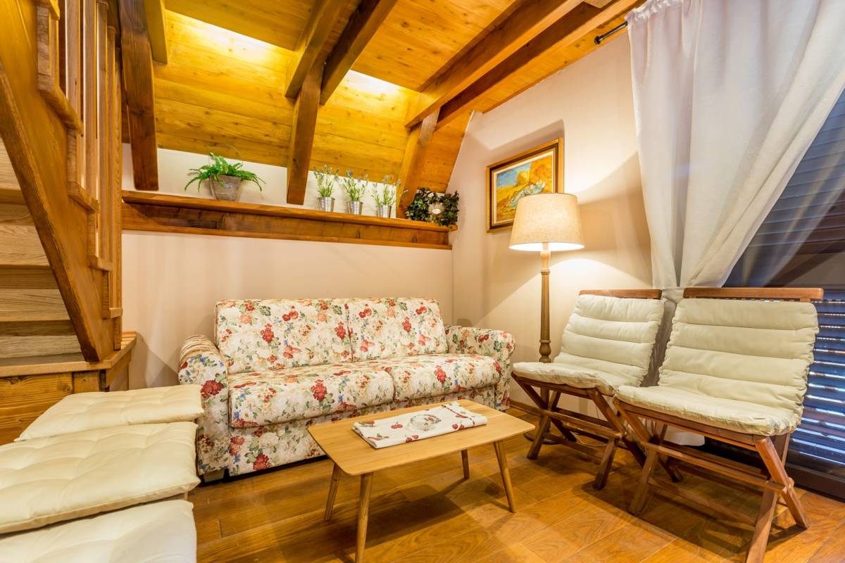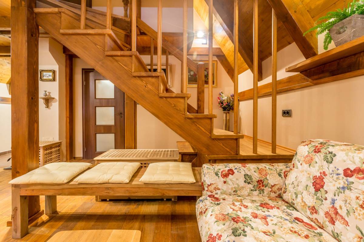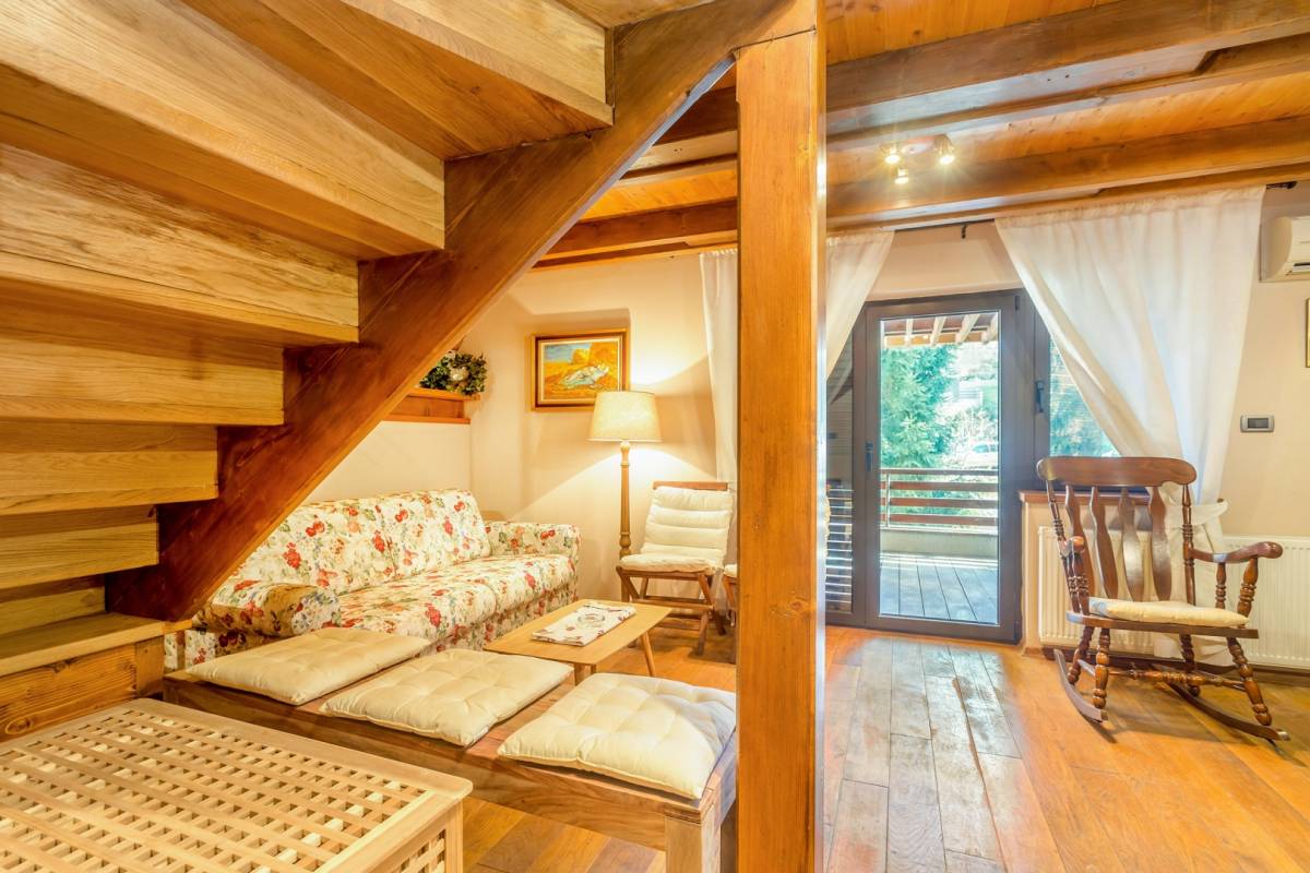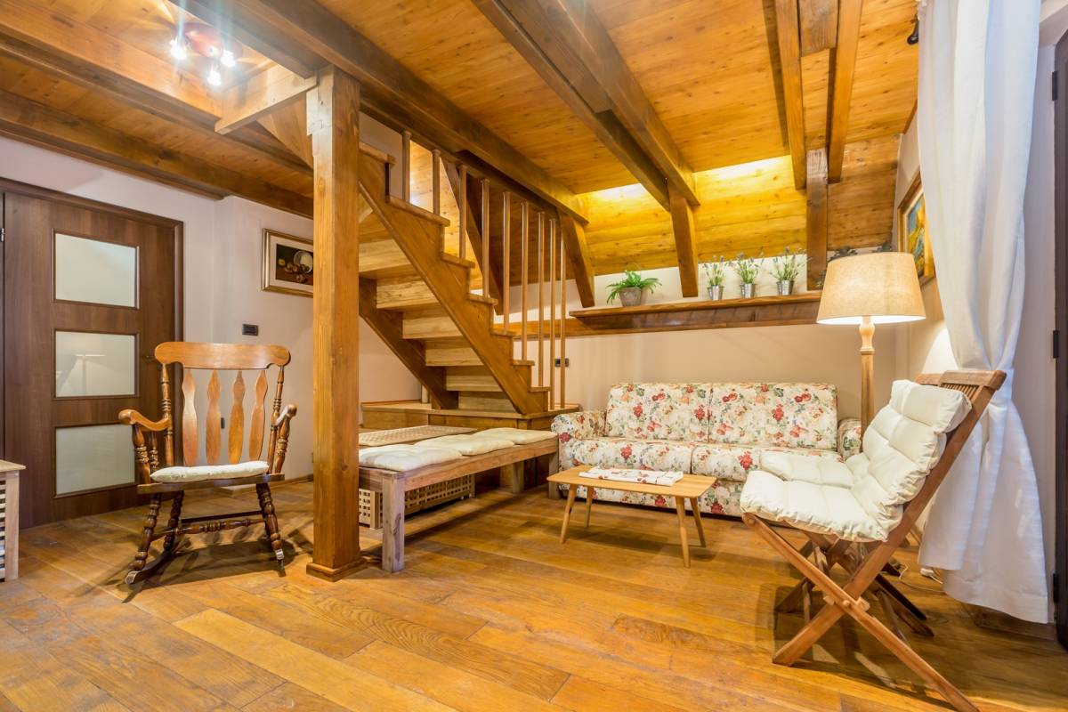 Prizemlje kuće rezervirano je za wellness zonu koja uključuje infracrvenu saunu, hidromasažni bazen, ležaljke za odmor i kupaonicu s tušem, bideom i WC-om. Iz wellnessa se izlazi na prostranu terasu. Na prvom katu nalazi se udoban dnevni boravak s blagovaonicom, opremljen klima uređajem i povezan s natkrivenom terasom, savršenom za uživanje u prirodi. Kuhinja je funkcionalna i potpuno opremljena, a na istoj etaži nalazi se i kupaonica s kadom i WC-om. Visoko potkrovlje sadrži dvije spavaće sobe s kosim stropovima, stvarajući ugodan ambijent za odmor.