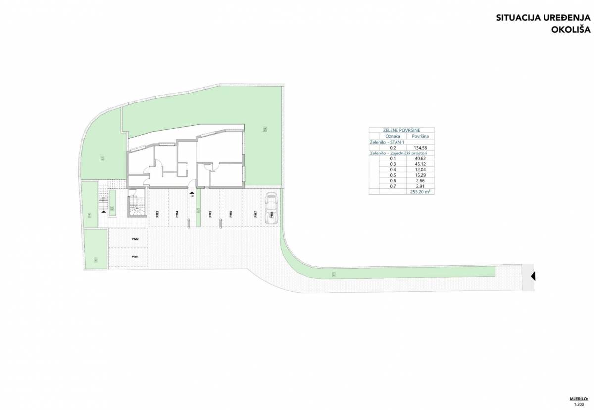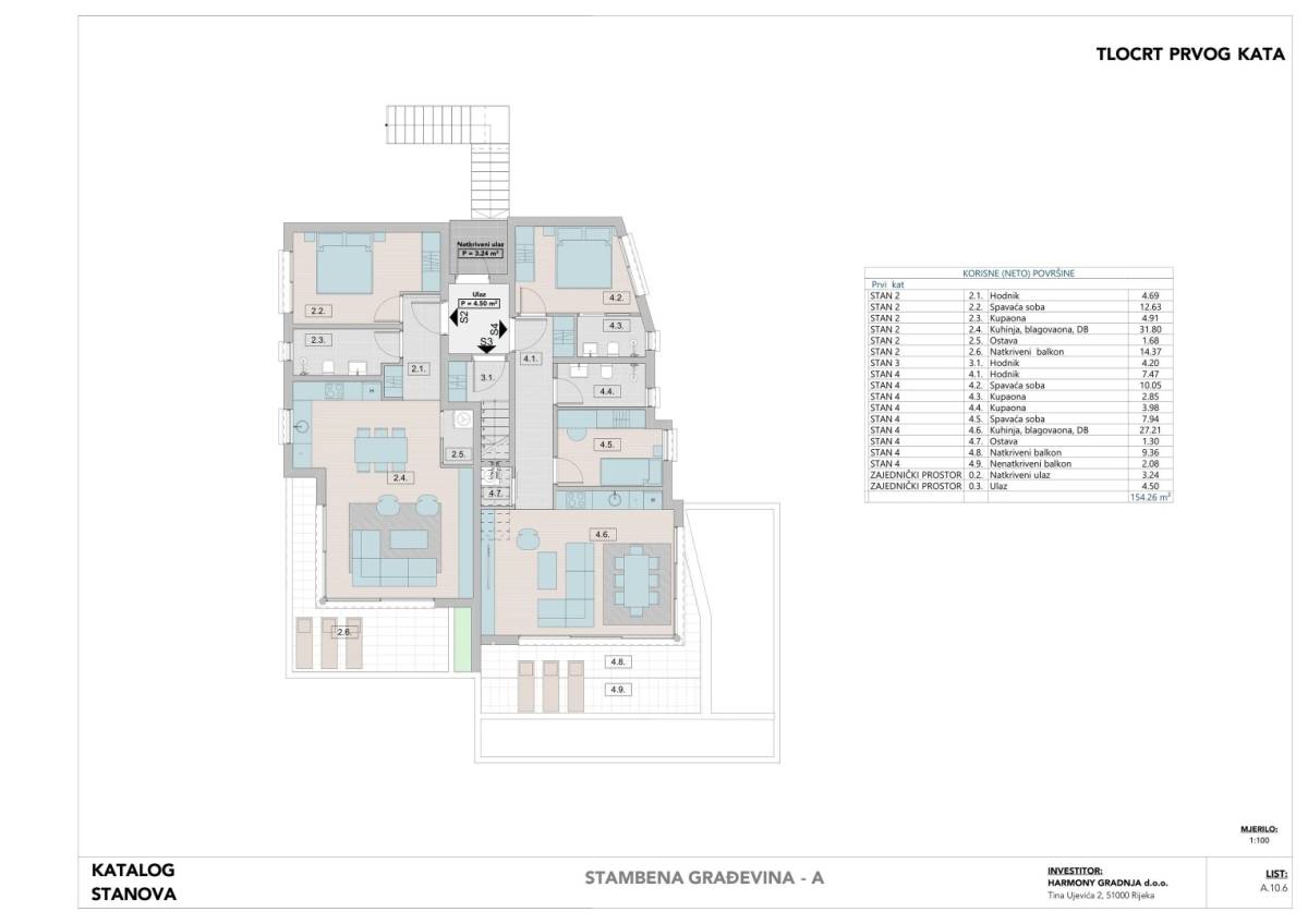 Stan se prostire na prostranom tlocrtu i obuhvaća ulazni prostor, otvoreni dnevni boravak s kuhinjom i blagovaonicom, tri spavaće sobe, tri kupaonice, ostavu te veliku natkrivenu terasu idealnu za opuštanje. Posebnu vrijednost daje krovna terasa površine 44 m², opremljena ljetnom kuhinjom, umjetnom travom i privatnim bazenom, s koje se pruža nezaboravan panoramski pogled na more i grad.