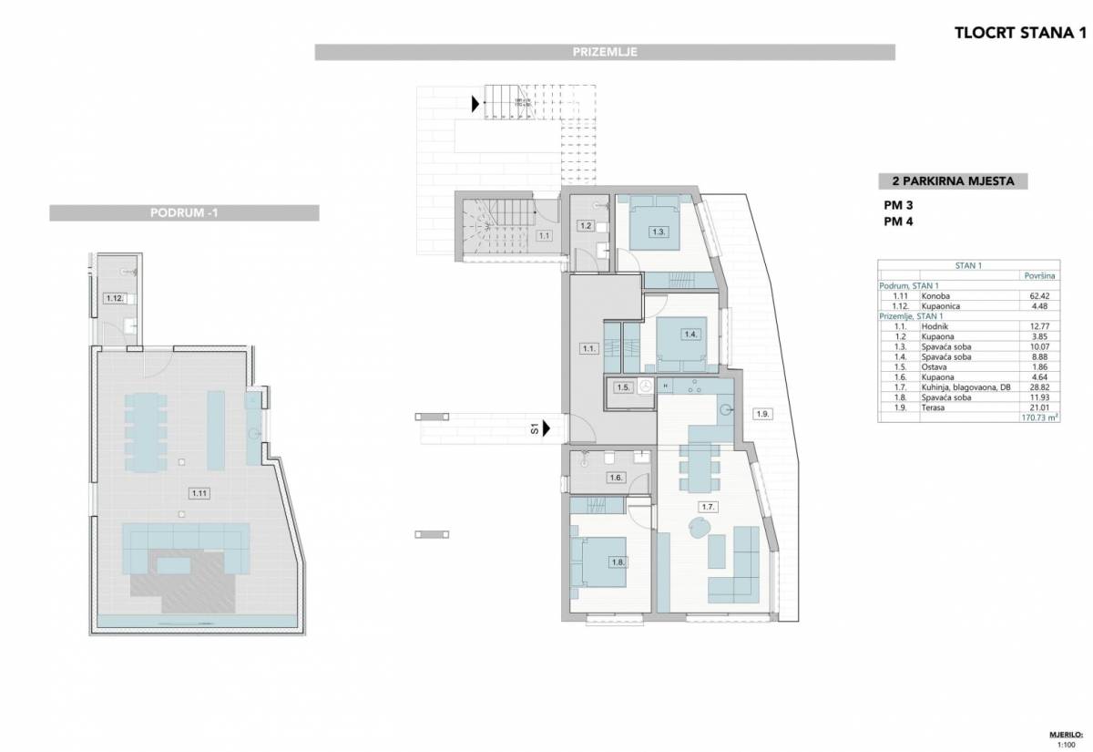 Posebna vrijednost nekretnine je pripadajući prostor u podrumu površine 69 m², pogodan za razne namjene, kao i dva osigurana parkirna mjesta.