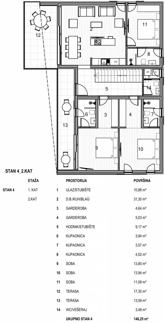 Apartman raspolaže s tri spavaće sobe pravilnih dimenzija, dvije garderobe koje dodatno povećavaju funkcionalnost prostora te tri kupaonice, čime je osigurana visoka razina komfora i privatnosti za sve korisnike. Dodatni WC s vešerajem doprinosi praktičnosti svakodnevnog života. Hodnik i stubište unutar apartmana logično povezuju sve prostorije, uz jasno definirane zone dnevnog i noćnog dijela.