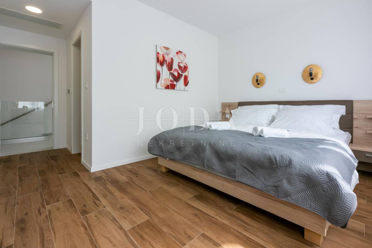 U unutrašnjosti se nalaze tri kupaonice, a prostor je klimatiziran, čime je osigurana udobnost tijekom cijele godine. Vanjski prostor uključuje privatni bazen, vrt i terasu, savršene za uživanje na otvorenom.
