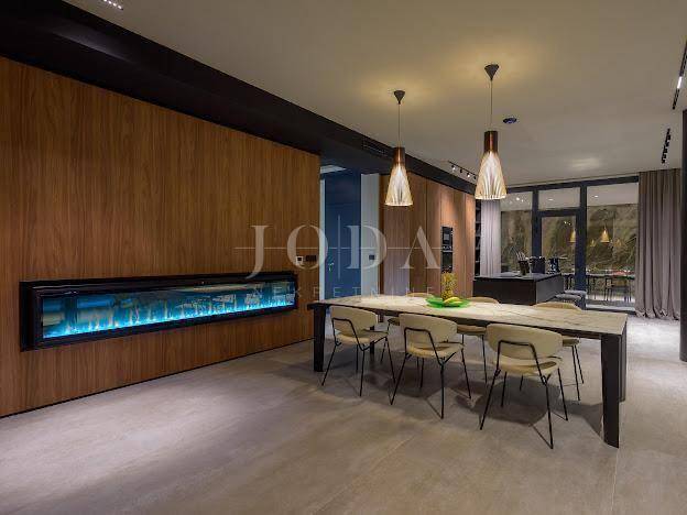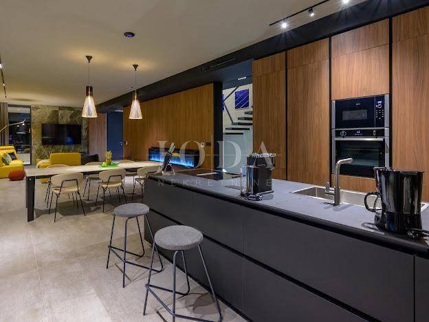 U prizemlju će Vas dočekati atraktivan s ukusom uređen dnevni boravak za opuštanje s namještajem i audio-vizualnom opremom i električnim kaminom koji mijenja boje i grije, a u nastavku potpuno opremljena kuhinja s otokom i blagovaona.