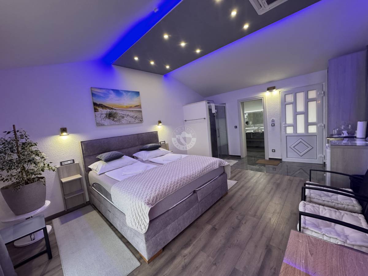 Prostrana stambena jedinica savršena za udoban život: kuhinja s blagovaonicom, dnevni boravak, spavaća soba, sprema i kupaonica. Izlaz na istočnu natkrivenu terasu uz prekrasan vrt s fontanom—idealno za druženje, opuštanje ili doručak s gostima. Na terasi su gostinjski WC i spremište. Na zapadnoj terasi čeka jacuzzi za potpuno opuštanje.