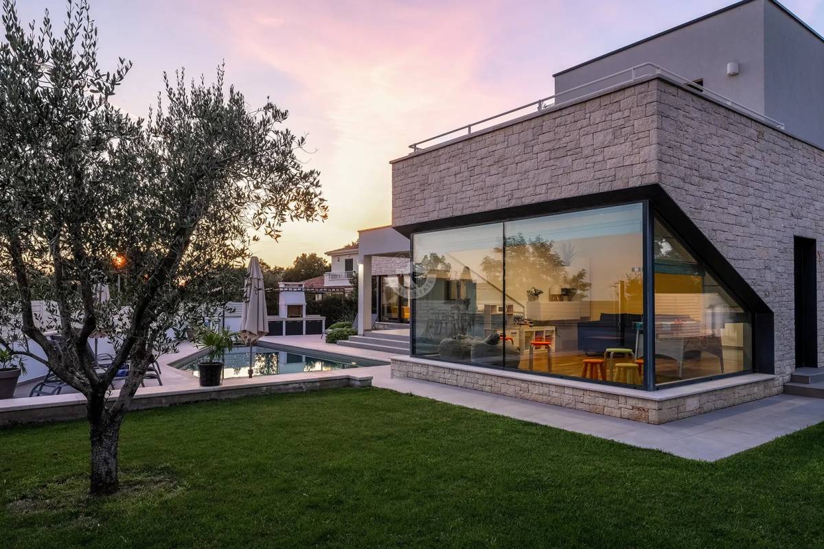 Vila se ističe modernom, otvorenom arhitekturom i pažljivo odabranim, visokokvalitetnim materijalima. Prostrani dnevni boravak, ispunjen prirodnim svjetlom, čini središnji dio kuće. Iz dnevnog prostora postoji izravan izlaz na terasu i bazenski dio, čime se postiže skladan prijelaz između unutarnjeg i vanjskog prostora. Potpuno opremljena dizajnerska kuhinja s integriranim aparatima otvoreno je povezana s blagovaonicom i pruža idealne uvjete za druženja i obiteljski život. Više lounge i boravišnih zona omogućuje fleksibilne mogućnosti korištenja za obitelji i goste. Sve prostorije su klimatizirane i opremljene podnim grijanjem, što osigurava visok stupanj komfora tijekom cijele godine.