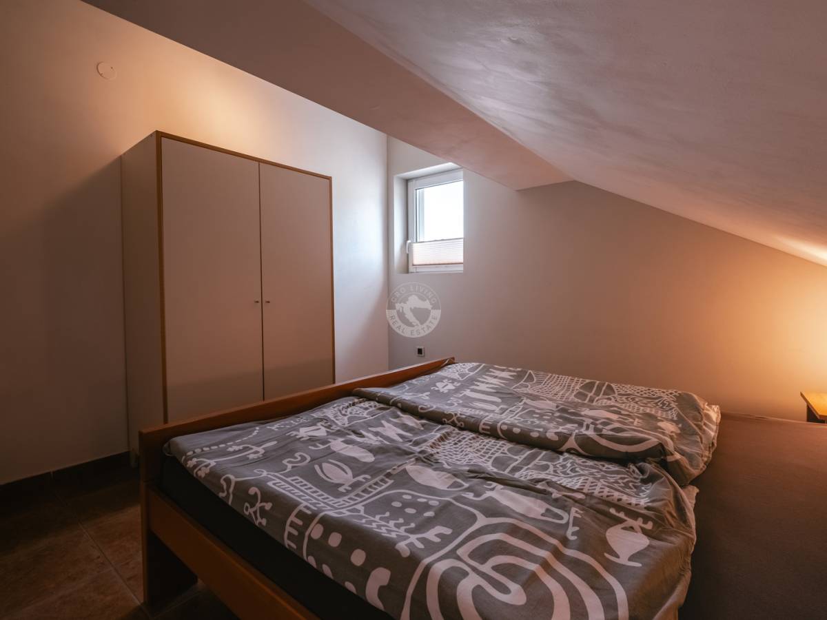 Ovaj stan na 2. katu nudi na cca 40,10 m2 atraktivnu kombinaciju funkcionalnog rasporeda, modernog komfora stanovanja i lijepog pogleda. Zbog položaja kuće na uzvisini pruža se ugodan pogled na more i na mjesto Vinjerac.