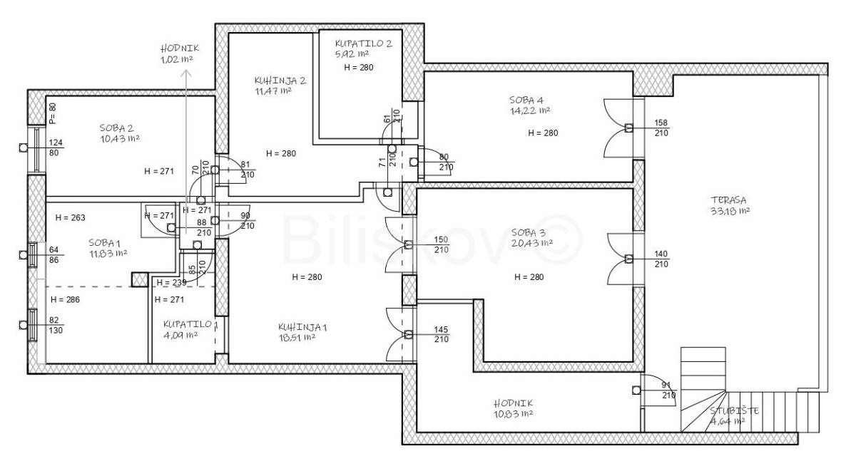 Sastoji se od dnevnog boravka, četiri sobe, dvije kupaone i spreme te terase i stubišta.