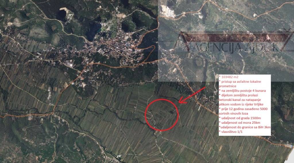 Prodaje se poljoprivredno zemljište ukupne površine 103482 m2 u Imotskom - Vinjani Donji, udaljeno svega 1,5km od centra grada. Zemljište ima sljedeće karakteristike: