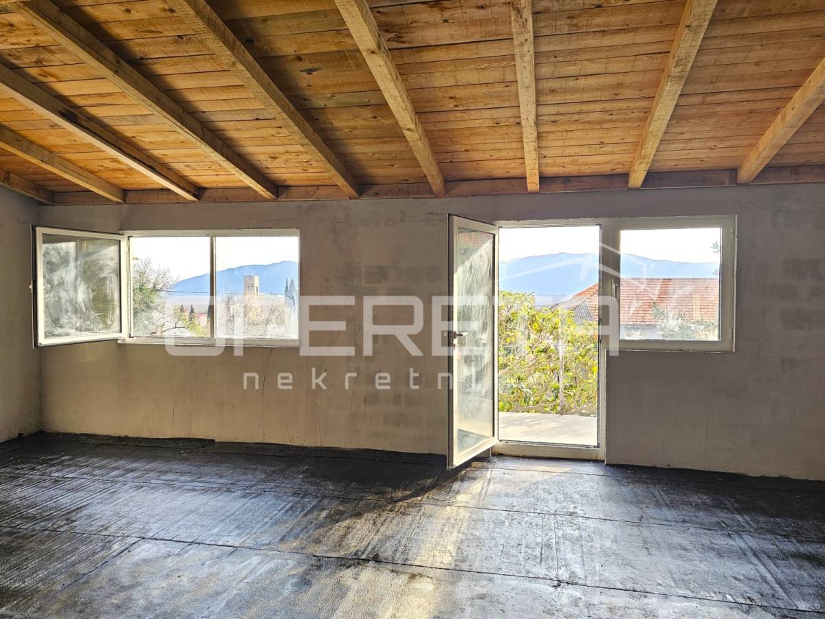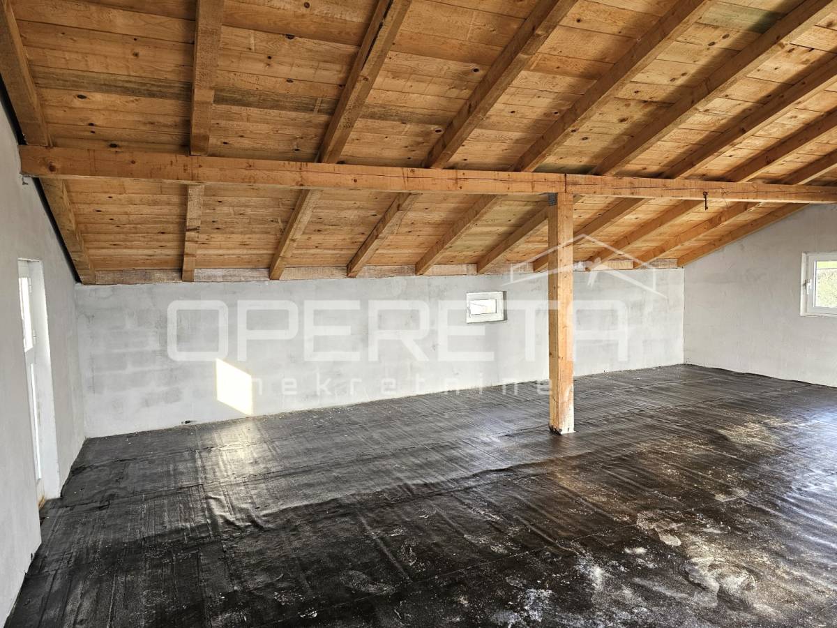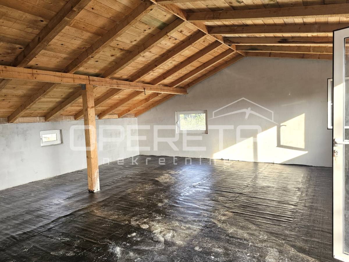 Na kat se dolazi vanjskim betonskim stepenicama. Gornja etaža, u naravi visoko potkrovlje u roh bau izvedbi, obuhvaća 46 m² zatvorenog prostora te dodatnih 24 m² nenatkrivene terase s otvorenim pogledom na planinu Biokovo i vrh Sv. Jure, idealno za uređenje prema vlastitim željama i potrebama.