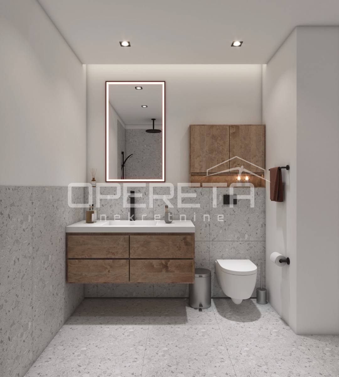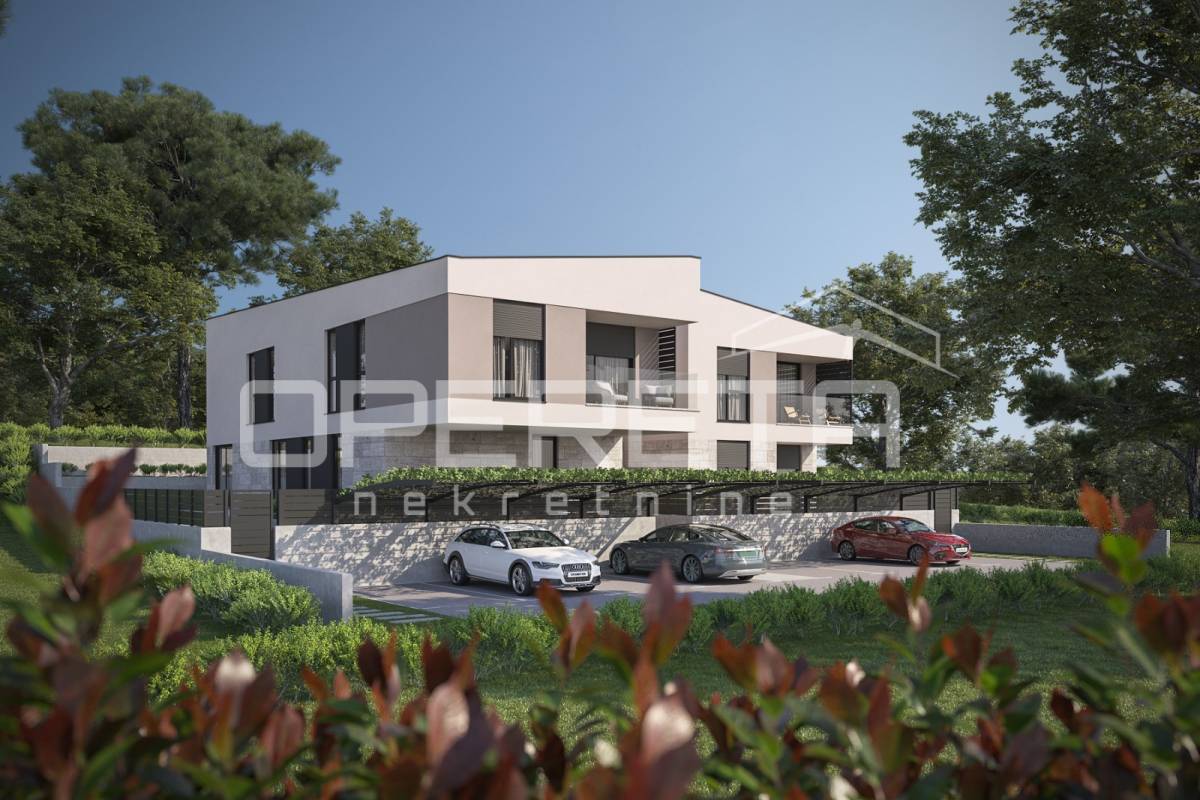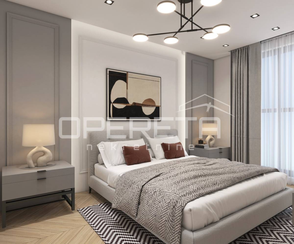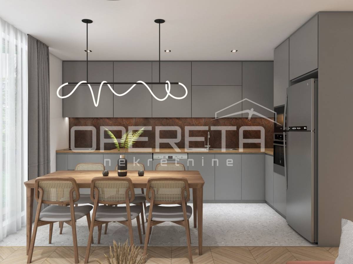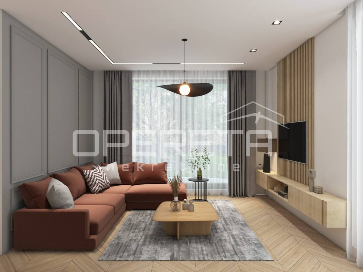 Stan obuhvaća ulazni hodnik, garderobu, spavaću sobu, kupaonicu te prostrani open space koncept s kuhinjom, blagovaonicom i dnevnim boravkom, s direktnim izlazom u vlastiti vrt površine 65 m².