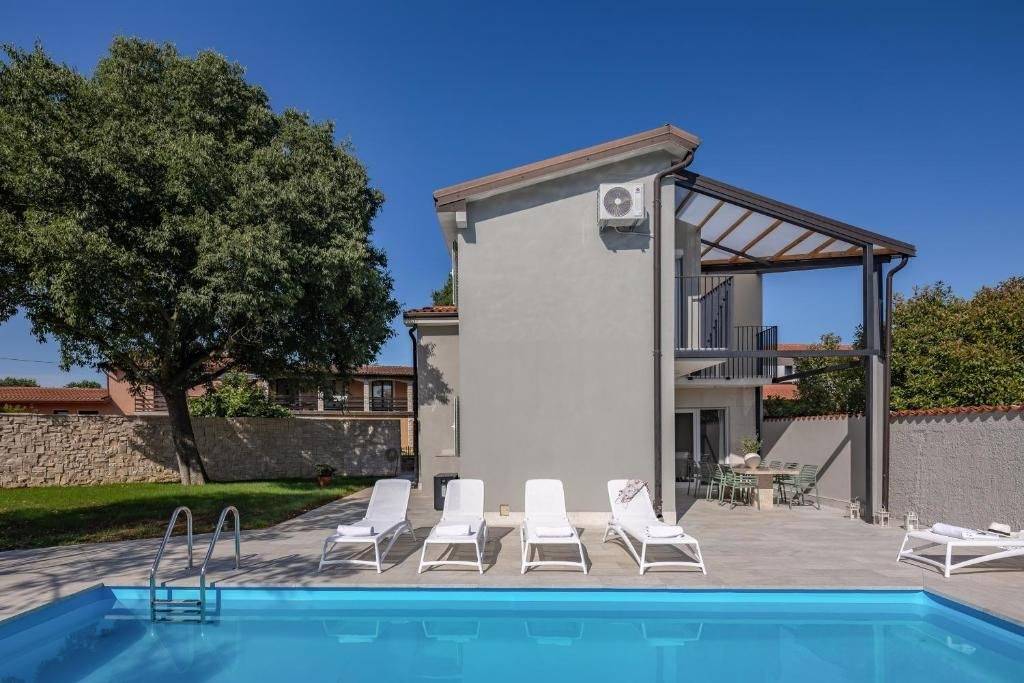 Na samo par minuta vožnje od mjesta Brtonigle i Novigrada, smještena u mirnoj ulici, nalazi se ova prekrasna luksuzna kuća sa bazenom!