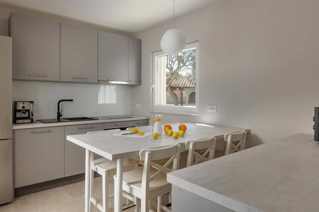 Kuća se proteže na dvije etaže ukupna površina 165 m2. U prizemlju se nalazi prekrasni dnevnog boravak sa kuhinjom i blagovaonicom, jedna spavaća soba, kupaonica i ostava. Iz dnevnog boravka se izlazi na natkrivenu terasu sa koje se pristupa ljetnoj kuhinji sa kaminom, grijanom bazenu s protustrujnim plivanjem, sunčalištu i prekrasno uređenoj okućnici.