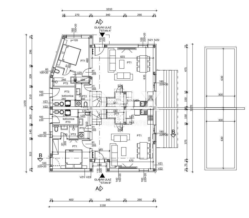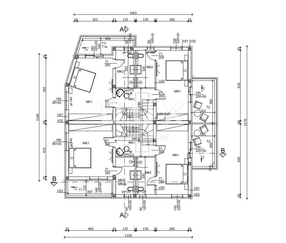 Površine je 154 m2. U prizemlju se nalazi prostrani dnevni boravak s kuhinjom i blagovaonicom, jedna spavaća soba s vlastitom kupaonicom, ostava, WC i vanjsko spremište. Iz dnevnog boravka izlazimo na natkrivenu terasu s pristupom dvorištu i bazenu. Na prvom katu nalazi se predsoblje i dvije spavaće sobe, svaka sa svojom kupaonicom i terasom.