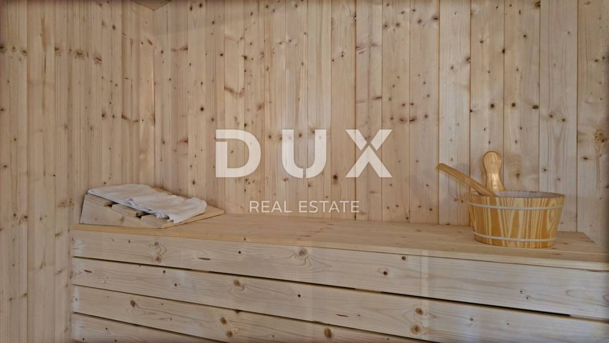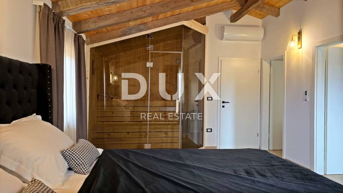 Kuća bezvremenskog šarma i arhitekture se oblikovno i koloristički uklopa u naselje i krajolik. Stambena površina konceptualno je zamišljena od dva dijela; dnevne i spavaće grupe prostora. Dnevna grupa prostora nalazi se u prizemlju i sastoji se od kuhinje, blagovaonice i dnevnog boravka u otvorenom konceptu s izlazom na natkrivenu terasu koja se nastavlja na plažu bazena, ostave i kupaonice. Spavaća grupa prostora nalazi se na katu i sastoji se od dvije spavaće sobe s vlastitim kupaonicama a jedna spavaća soba sadrži i saunu.