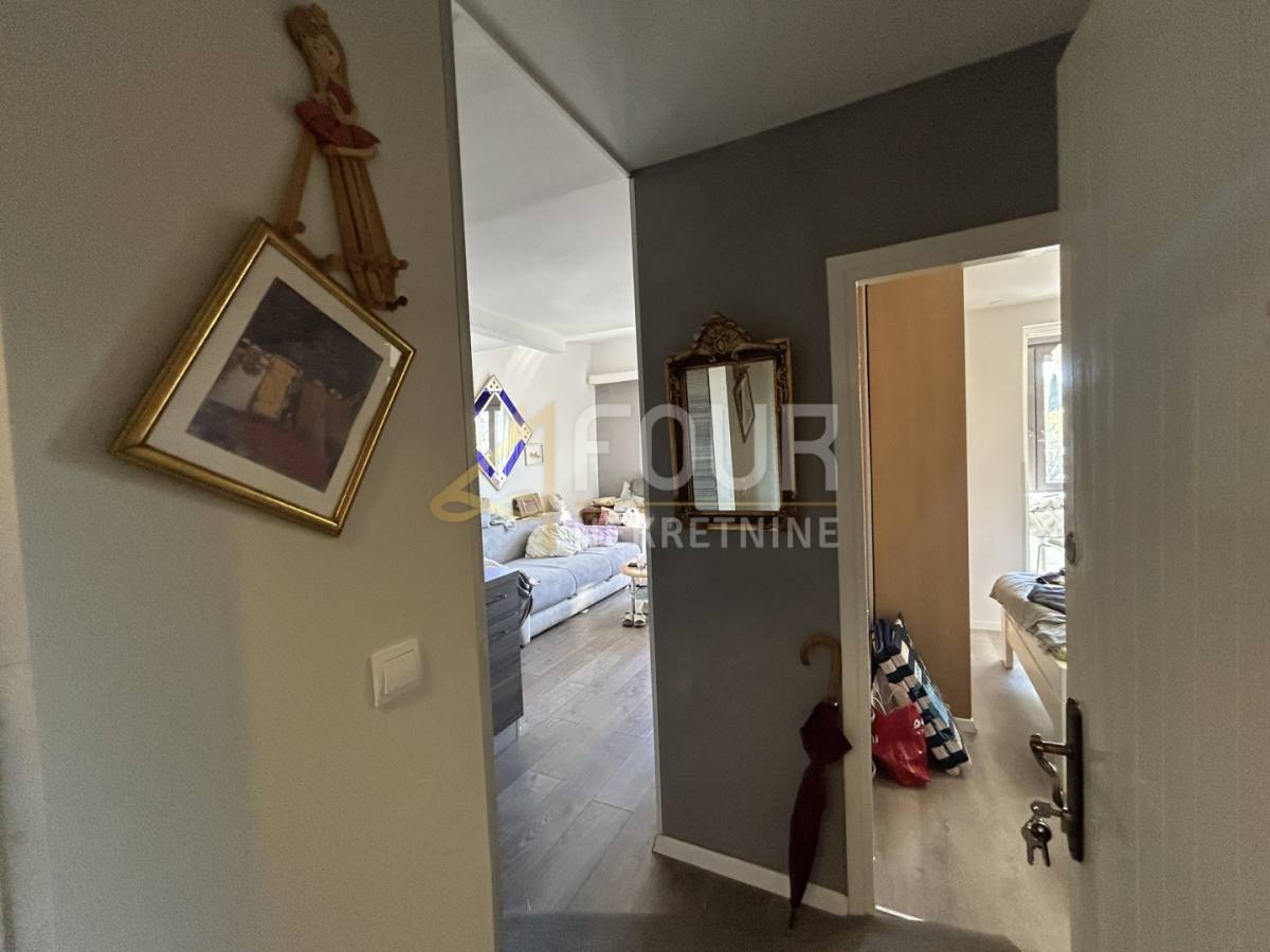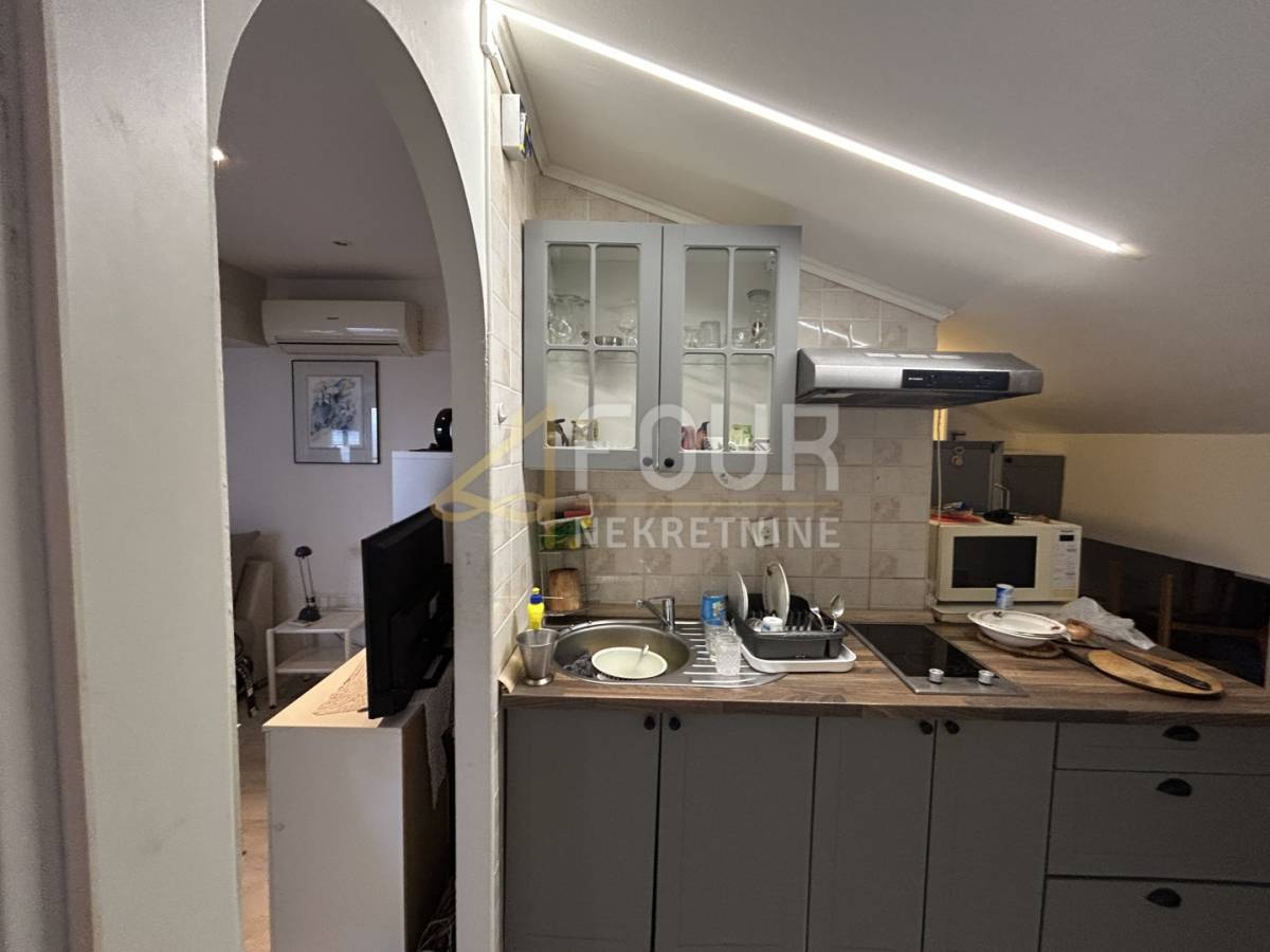 Nekretnina je raspoređena na dvije etaže koje su koncipirane kao dva zasebna stambena prostora, što pruža fleksibilnost za različite načine korištenja. Donja etaža obuhvaća hodnik, kupaonicu, dnevni boravak s kuhinjom, predsoblje i spavaću sobu. Unutarnje stepenice vode na gornju etažu u kojoj se nalaze dnevni boravak s izlazom na zatvorenu terasu s pogledom na more, kuhinja, spremište, spavaća soba i kupaonica. Terasa na gornjoj razini površine je približno 4 m2 i predstavlja posebnu vrijednost stana zbog otvorenog pogleda.