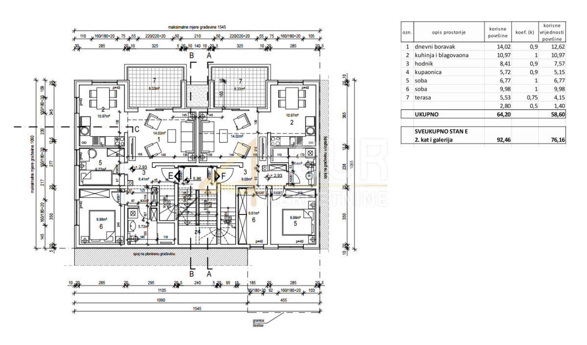 2. kat površine 58.60m2 sastoji se od dnevnog boravka s kuhinjom i blagovaonicom, hodnika, kupaonice, dvije sobe i terase.
