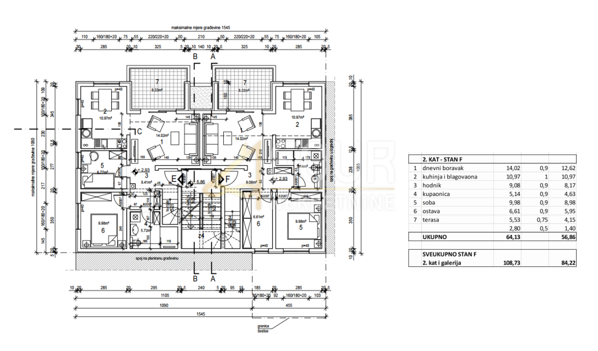2. kat površine 58.86m2 sastoji se od dnevnog boravka s kuhinjom i blagovaonicom, hodnika, kupaonice, ostave, jedne sobe i terase.