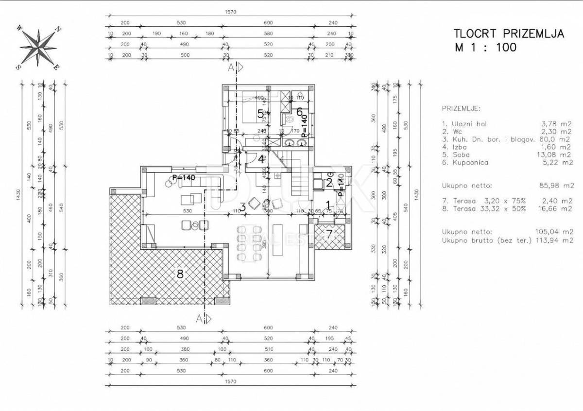 Moderna vila građena je kao katnica. U prizemlju se nalazi dnevni boravak, kuhinja i blagovaonica u otvorenom konceptu s izlazom na natkrivenu terasu, spavaća soba s vlastitom kupaonicom, ulazni hol, toalet i ostava. Na katu su smještene tri spavaće sobe s vlastitim kupaonicama i terasa.