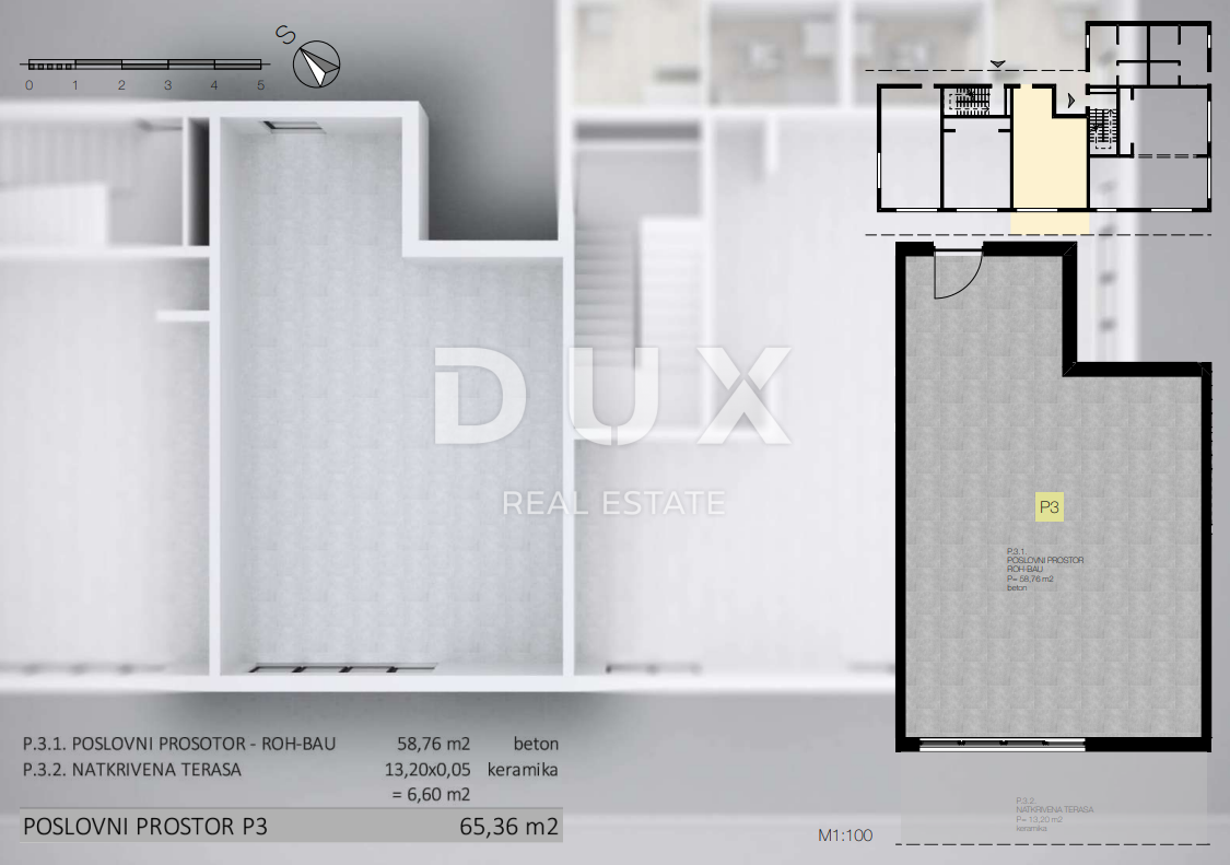 Sastoji se od prostorije u roh bau fazi ukupne površine 58,76 m² i natkrivene terase obložene keramikom površine 6,60 m².