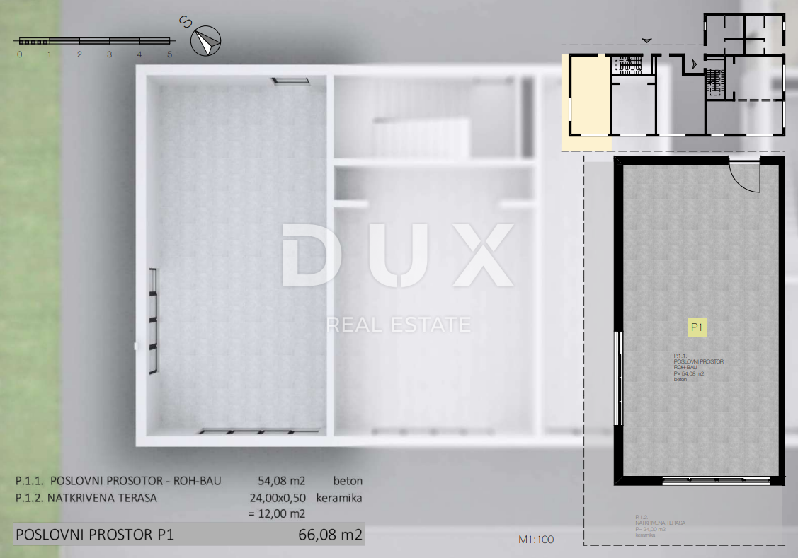 Nalazi u prizemlju nove poslovno-stambene zgrade. Sastoji se od prostorije u roh bau fazi ukupne površine 54,08 m² i natkrivene terase obložene keramikom površine 12,00 m².