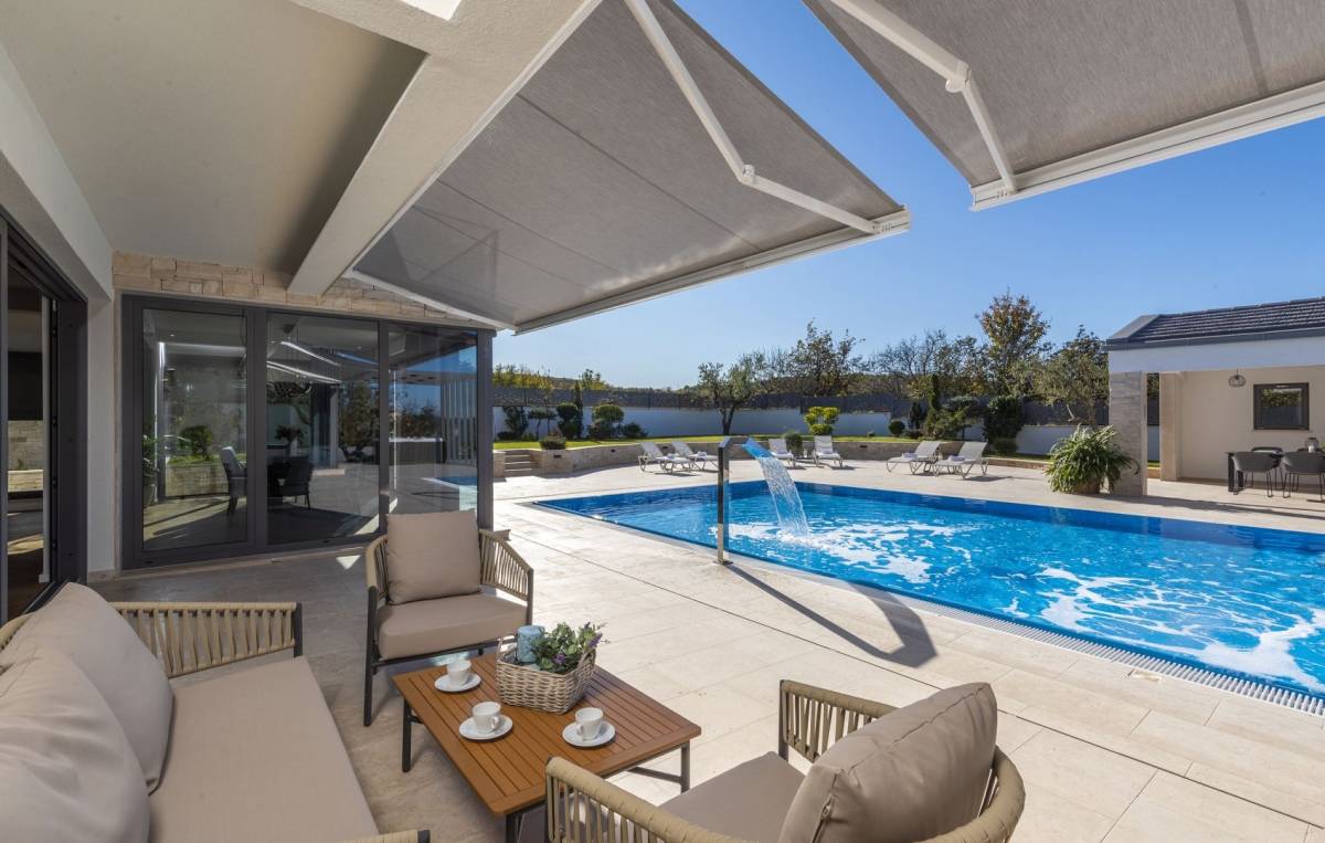 Centralnu zonu istinskog opuštanja i mira svakako zauzima bazen površine 60 m² sa sunčalištem. U prostoriji za održavanje bazena nalazi se pumpa za dogrijavanje vode i pumpa sa tri trimera, kako bi se automatski moglo održavati klor i PH faktor vode u bazenu, a tu je i robot za čišćenje samog bazena. Uz bazen se smještena natkrivena ljetna kuhinja s kaminom i vanjskom blagovaonom i ostavom i dječje igralište sa gumenom podlogom.