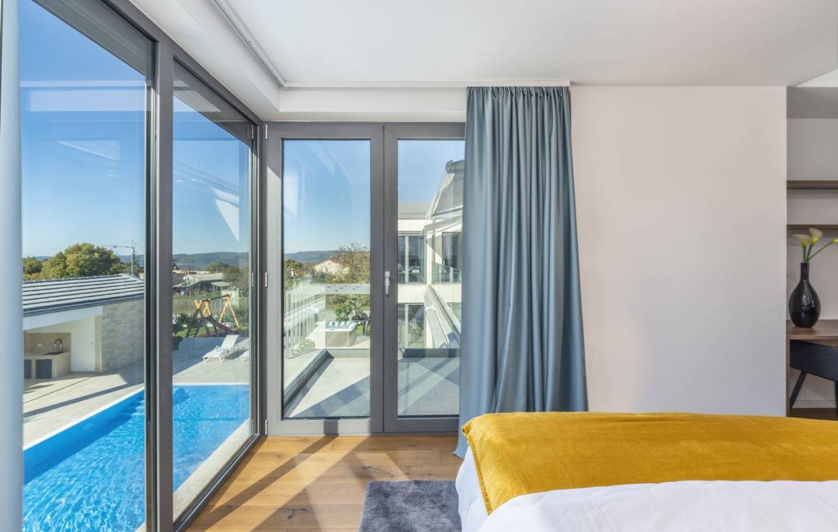 Velik dio kuće čine elegantne staklene stijene koje omogućuju puno prirodnog svjetla koje su suptilna granica između interijera i eksterijera. Sva stolarija i staklene stijene izvedene su od AluK aluminijskih profila, ostakljene troslojnim toniranim staklom sa screen rolo sjenilima i komarnicima. Na terasama su postavljene i tende sa električnim sustavom otvaranja i zatvaranja sa senzorom u slučaju nevremena. Opremljena je Daikin klima uređajima, toplinskom pumpom, video nadzorom i alarmnim sustavom.
